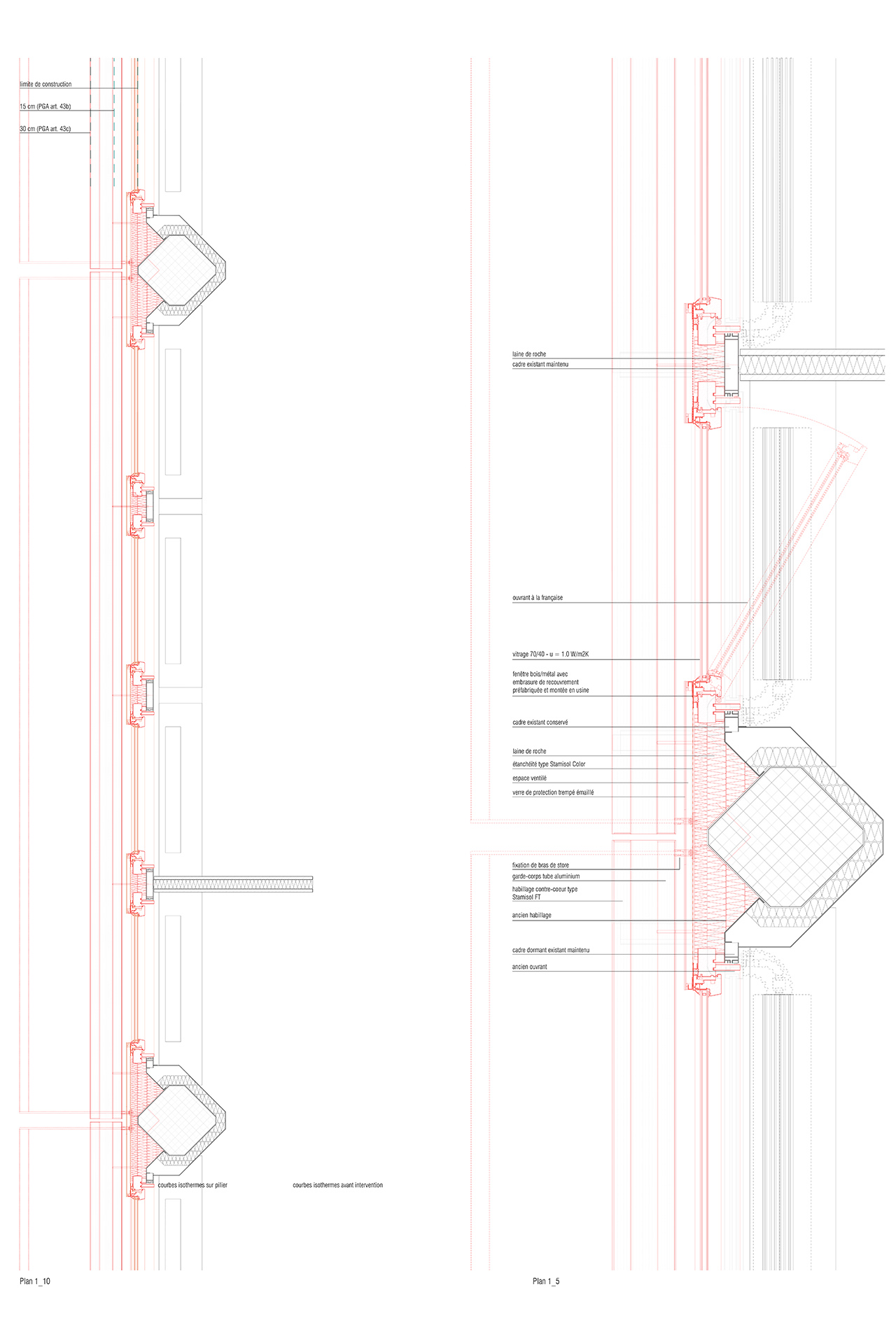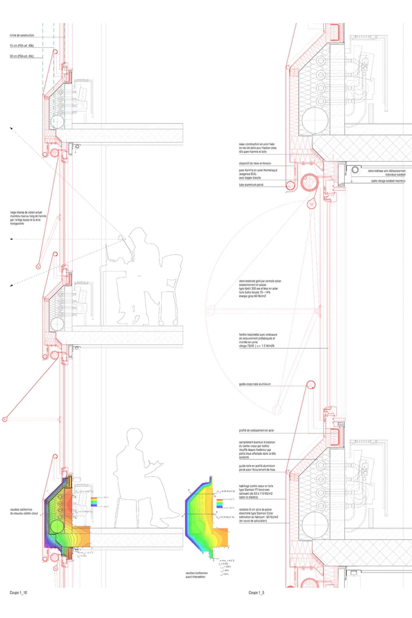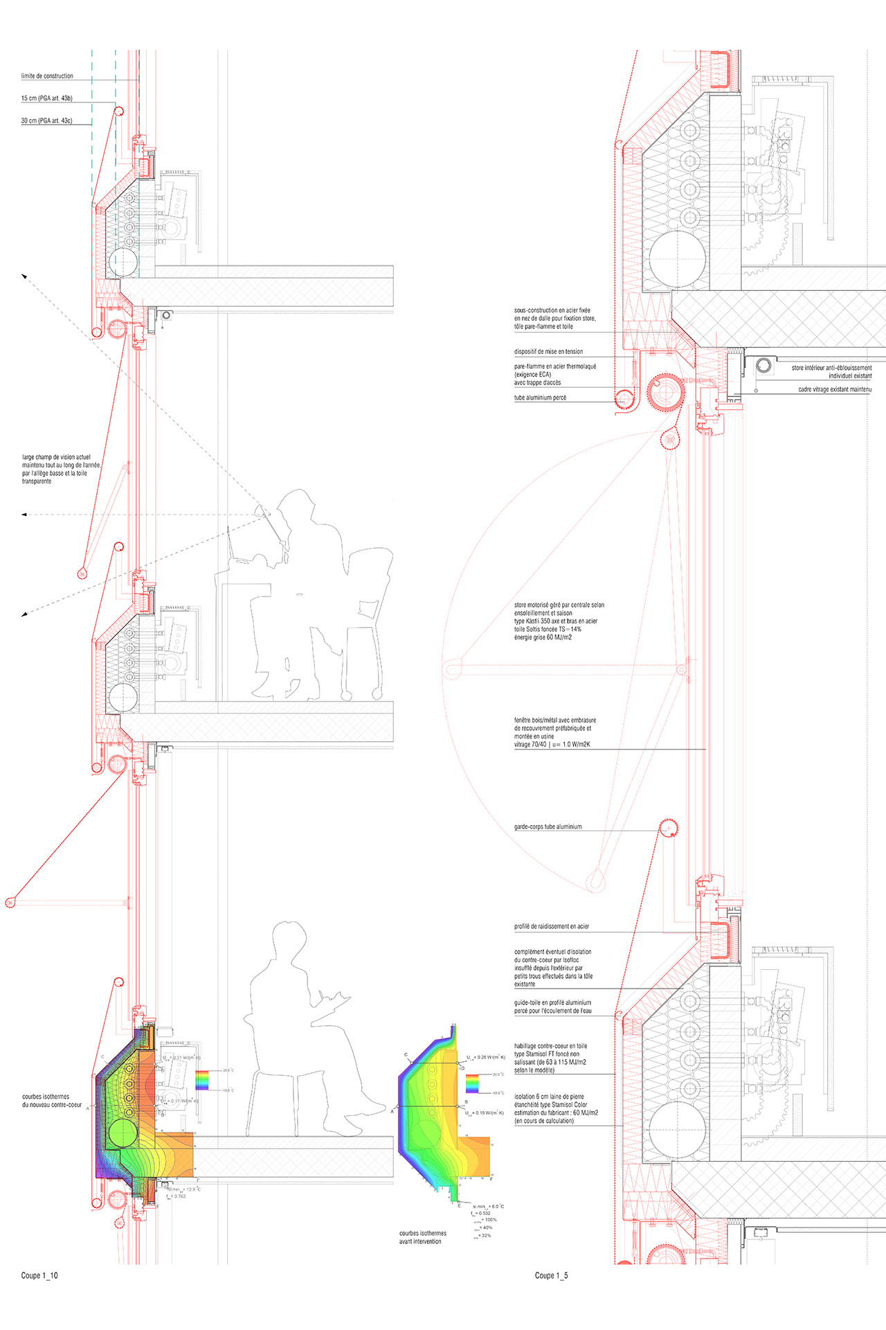 La toile, ondulant par bandes horizontales, unifie l’ensemble de la façade. En contrecœur, elle est simplement tendue entre le garde-corps et le caisson de store, et permet la vue vers la rue. La même toile est utilisée pour les stores, dont la position varie pour chaque façade en fonction des saisons et des heures de la journée. Elle produit des jeux de transparences, qui varient par l’alternance des bandes colorées en deuxième plan et par l’incidence de la lumière solaire.