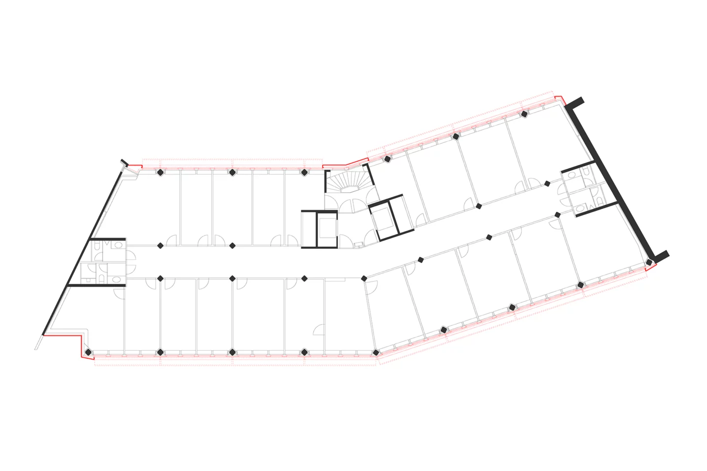 La nouvelle image du bâtiment n’est pas issue d’une volonté esthétique à priori, mais découle des résolutions techniques, thermiques, écologiques, économiques et réglementaires. Le bâtiment peut être perçu comme une machine de bureaux: la bande horizontale de fenêtres ne différencie pas les locaux intérieurs, mais exprime la flexibilité et le collectif.