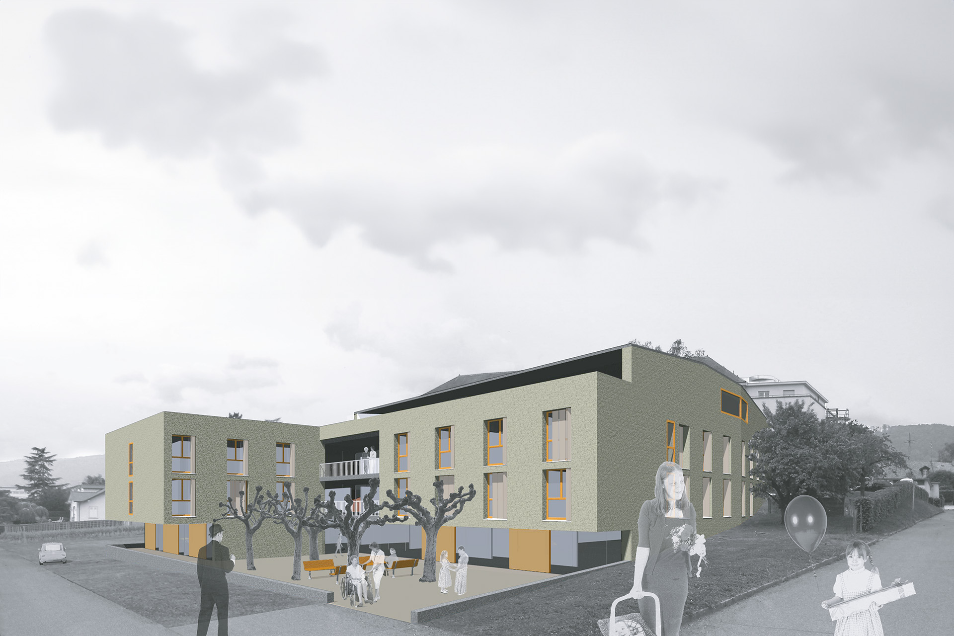 L’EMS est perçu comme une grande maison avec séjour au rez, chambres aux 1er et 2e étages et salle à manger au dernier niveau. L’escalier central, ouvert sur les espaces communs des unités, apporte animation, sons et odeurs dans les unités: les résident·es, même confinés sur leur étage, sont en relation olfactive, auditive et visuelle avec les activités des autres niveaux.