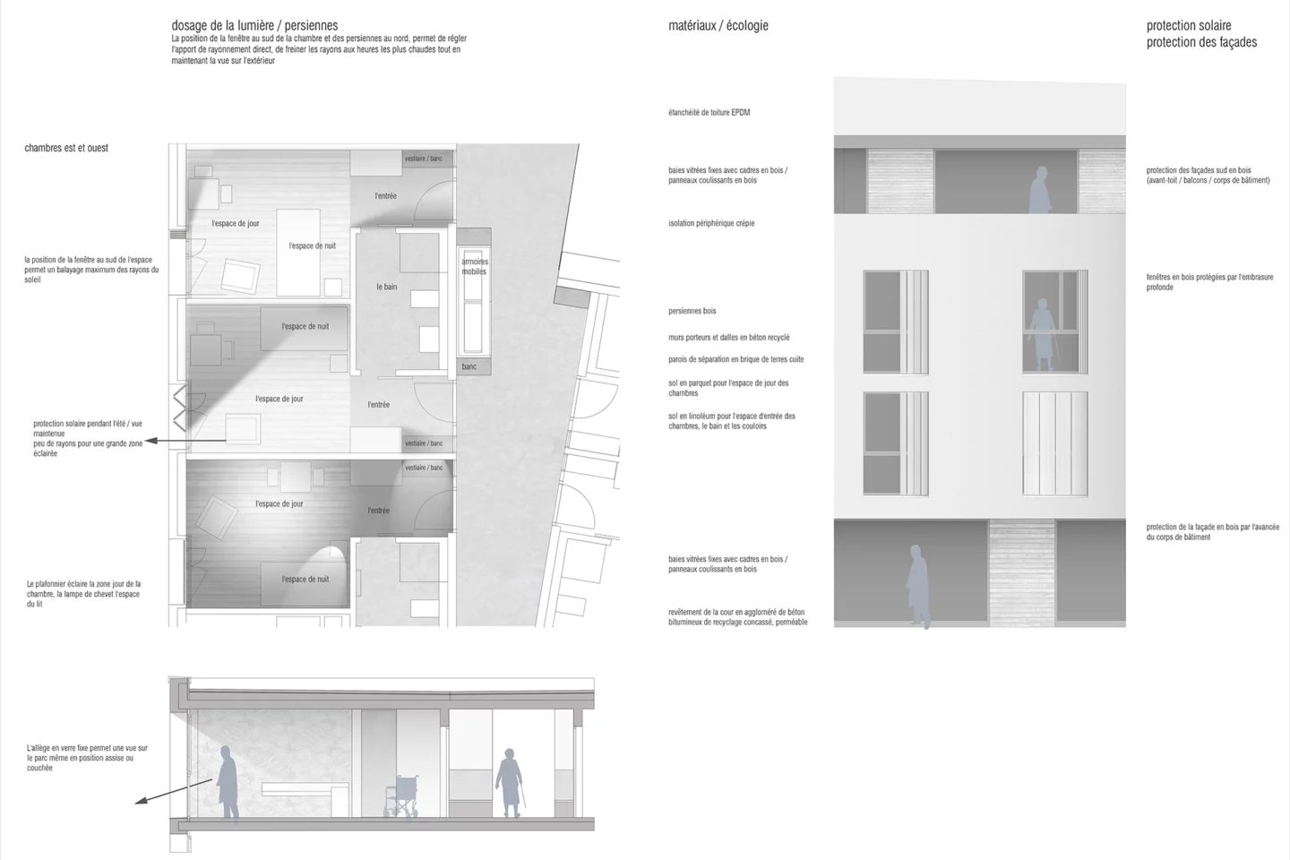 Tous les espaces communs, orientés vers le sud, se prolongent par des terrasses, qui offrent une protection solaire efficace aux espaces des niveaux inférieurs.