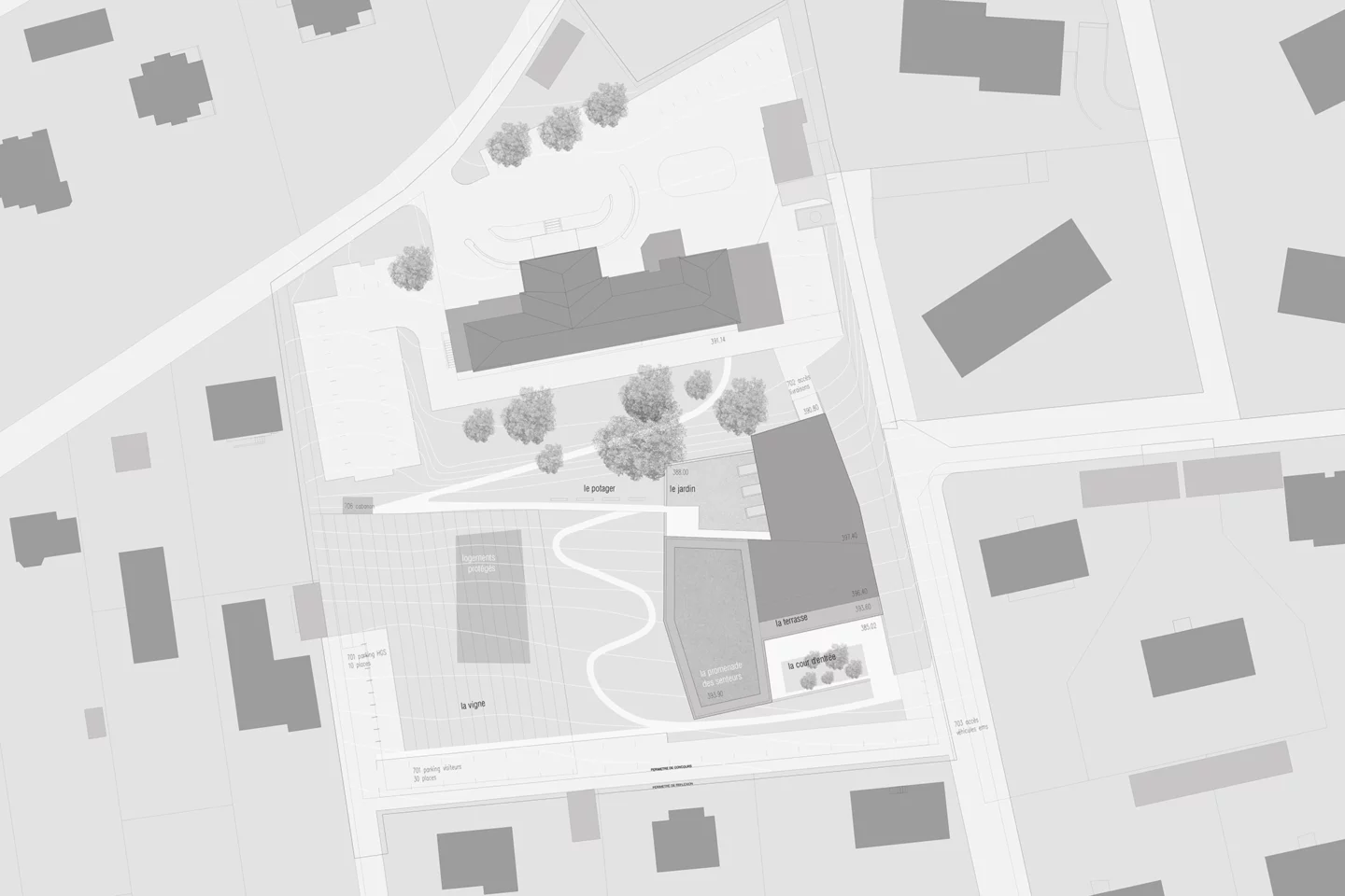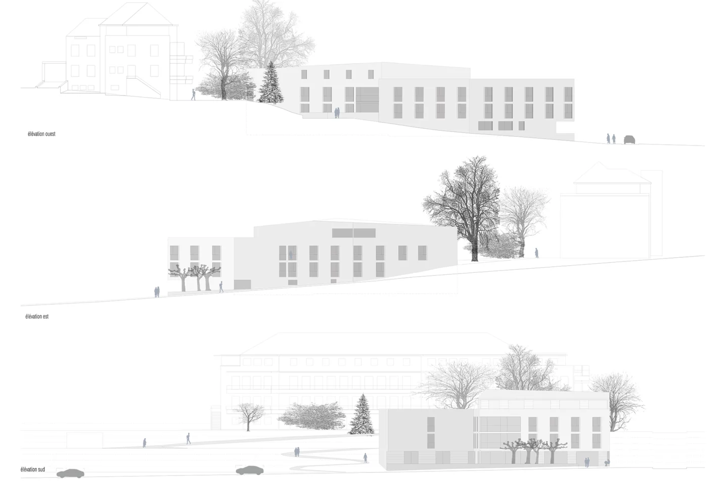 Par sa forme et son assise dans le terrain, le bâtiment génère des espaces extérieurs en relation directe avec els différents niveaux: la cour d’entrée et les séjours communs, le jardin et l’unité de gériatrie, les livraisons et l’esplanade de l’hôpital.