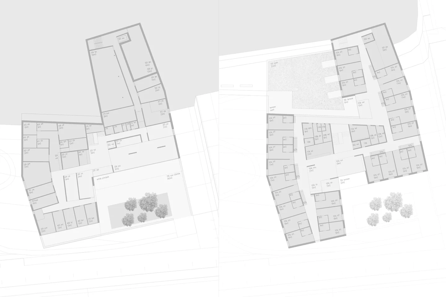 La cour d’accès est le lieu privilégié d’échange avec la ville et la population. Les espaces communs sont organisés autour de cet espace et y trouvent leurs prolongements extérieurs.