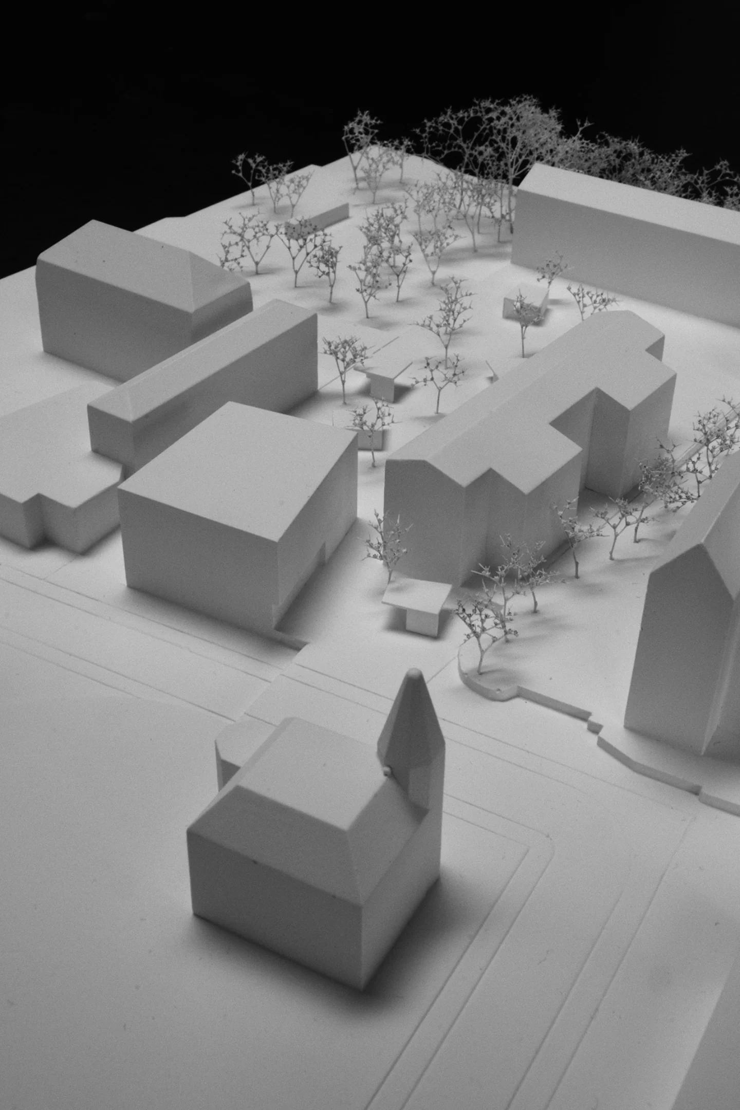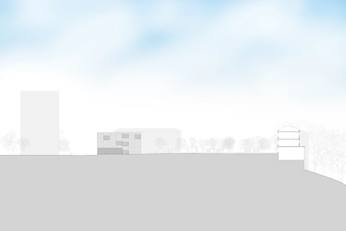 Le nouveau bâtiment s’insère de manière autonome en limite de rue, protège la cour et crée une place d’entrée en relation avec la rue. Son expression le distingue des bâtiments préexistants pour ne pas les concurrencer.