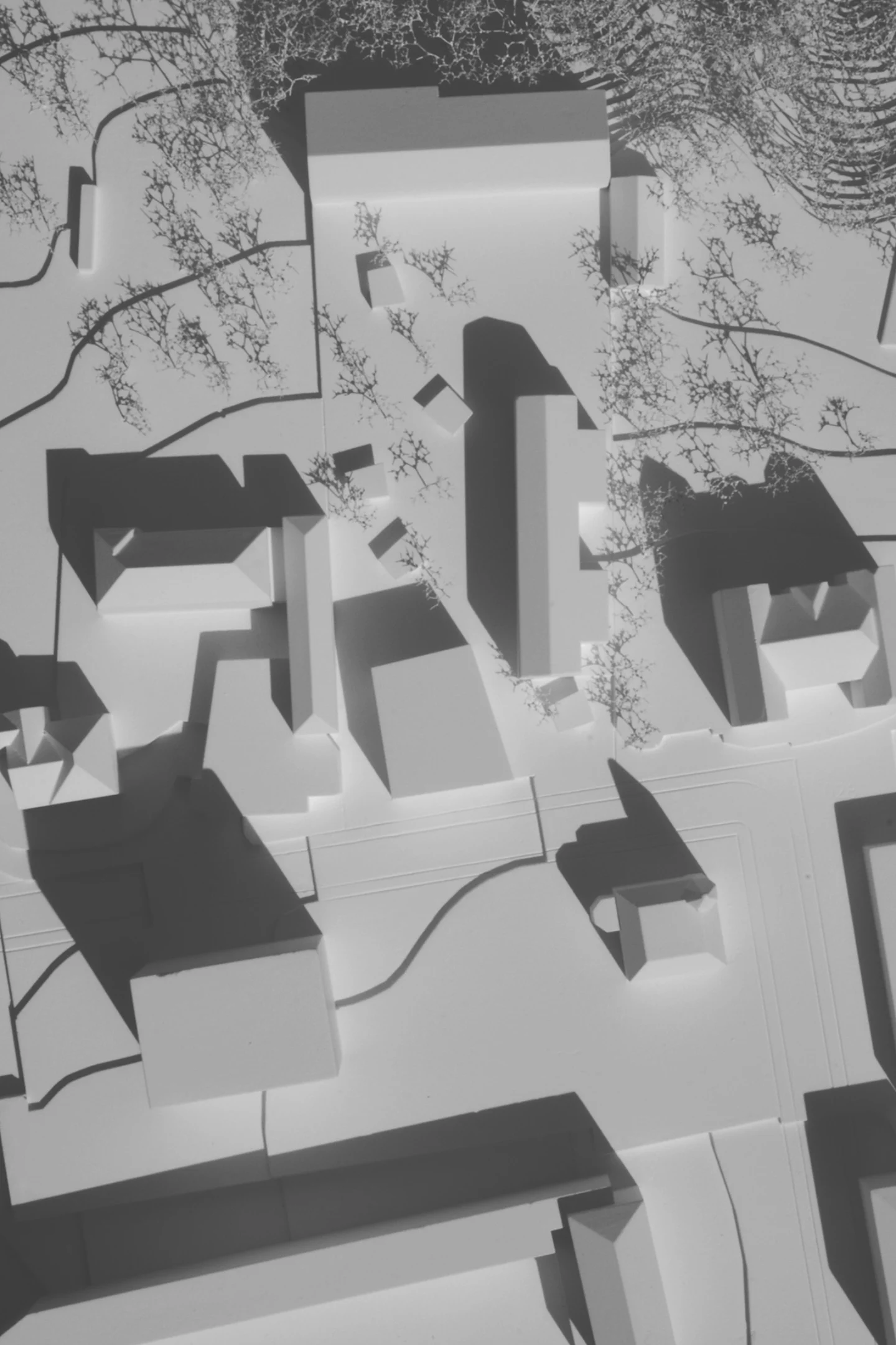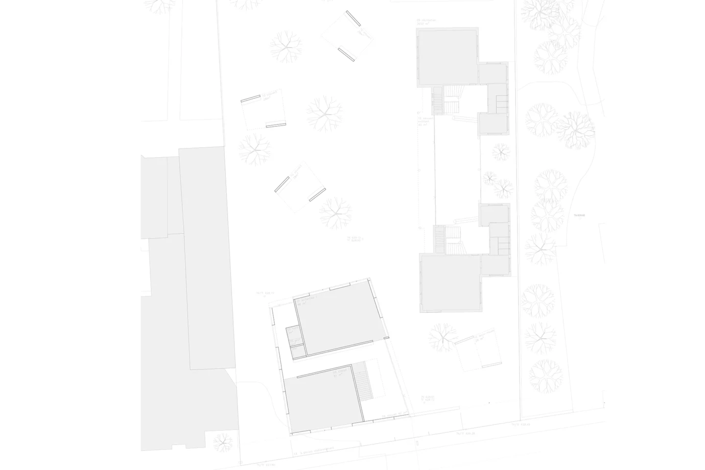 Les trois bâtiments gravitent autour de l’espace de référence de la cour qui profite d’ouvertures visuelles sur les espaces verts environnants.