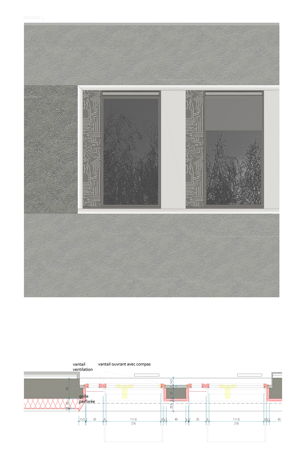 les fenêtres sont remplacées par de nouveaux ensembles comprenant une grande surface vitrée accompagnée d’un volet d’aération. Un important gain de lumière naturelle est apporté en faveur des locaux plus profonds nécessaires aux nouvelles activités.