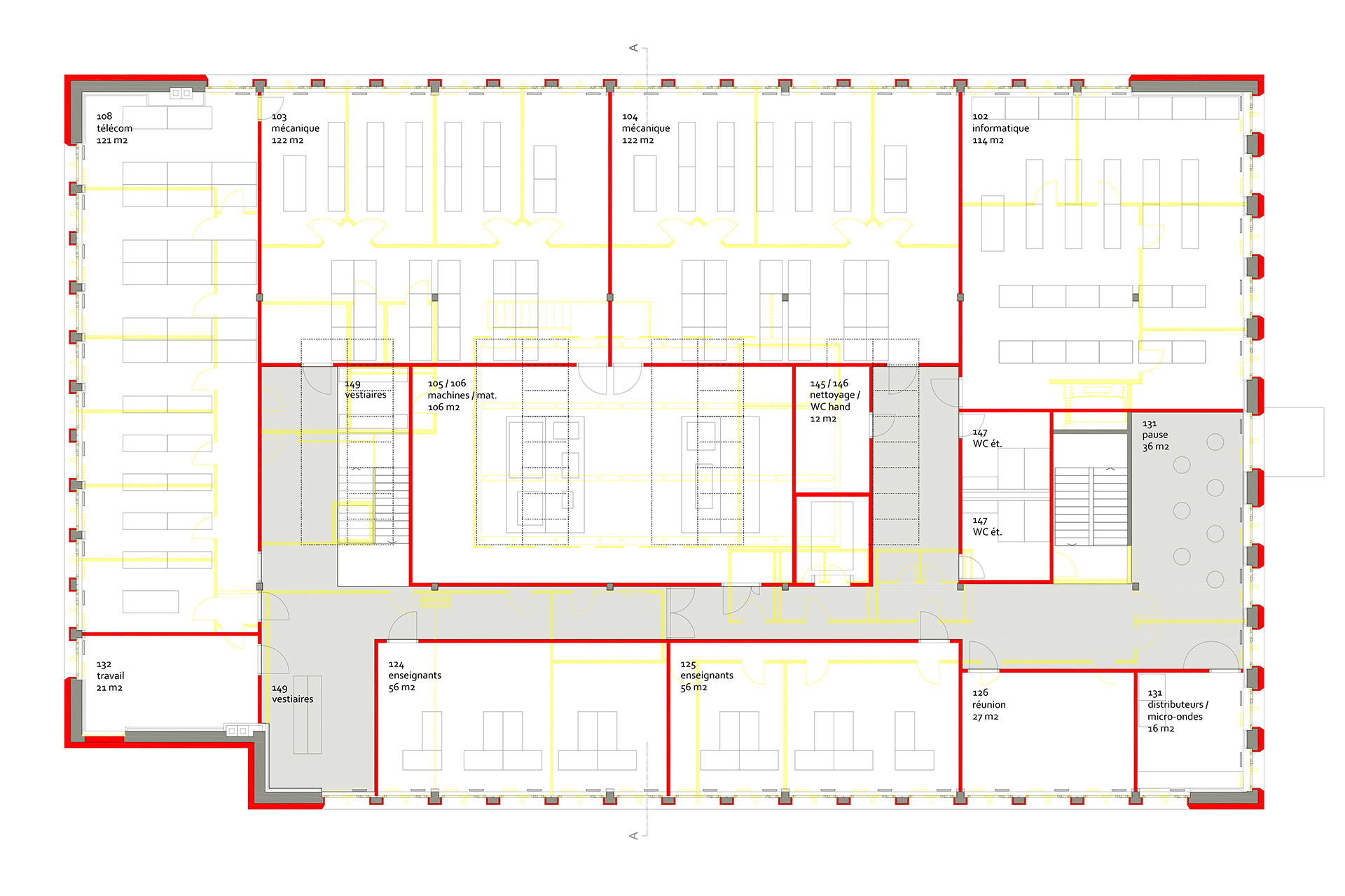 Les circulations verticales existantes ont été préservées, ce qui définit au préalable les différentes profondeurs des locaux / ateliers d’enseignements et leurs orientations. Leur cloisonnement est adapté au rythme principal de la structure porteuse et compose avec les ouvertures zénithales existantes.