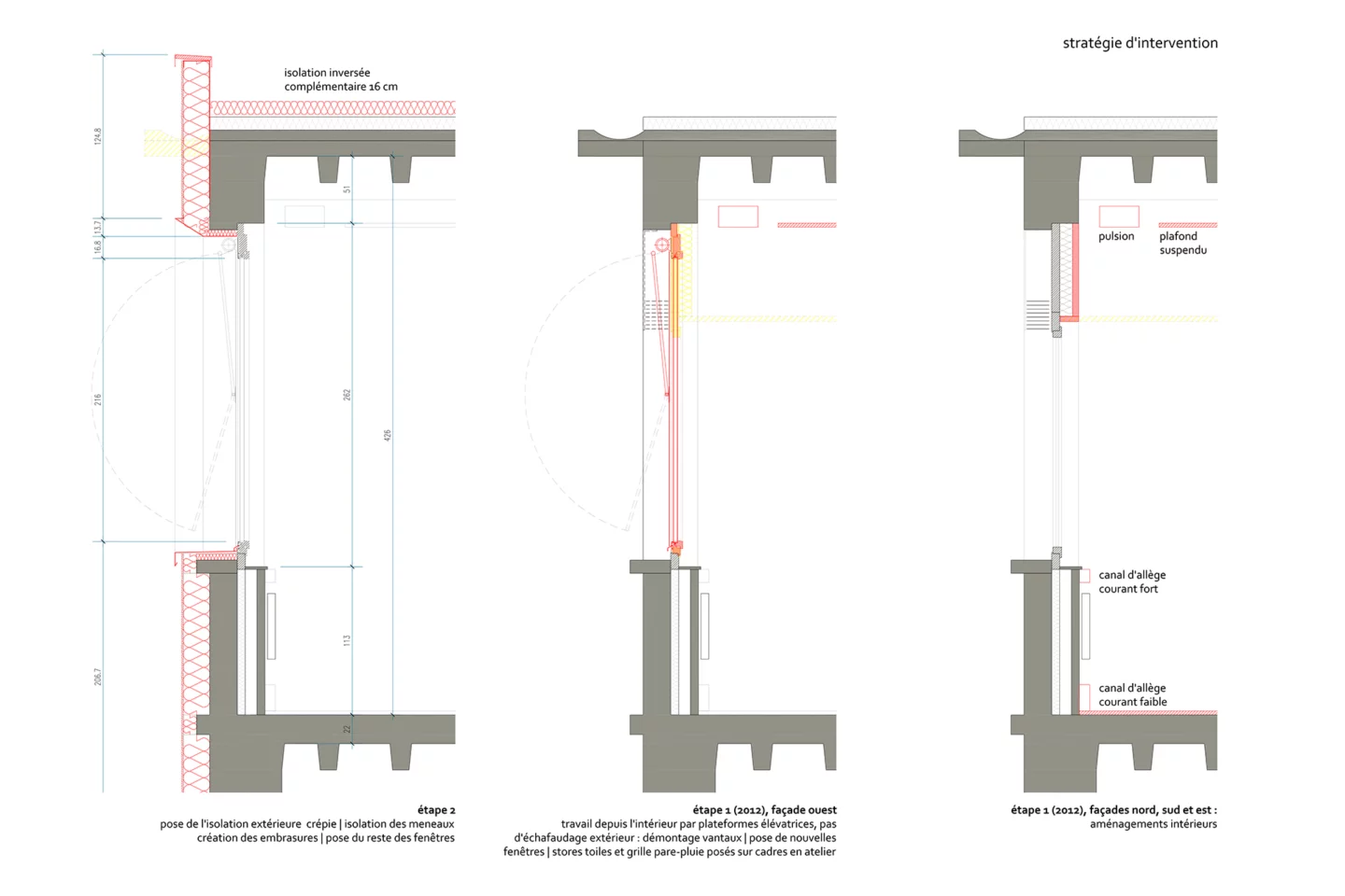 Pour exprimer le caractère originel de la façade du bâtiment, l’amélioration thermique de l’enveloppe est complétée par une isolation périphérique, par un complément d’isolation inversée en toiture et par une isolation sur dalle contre-terre, sous une nouvelle chape flottante.
