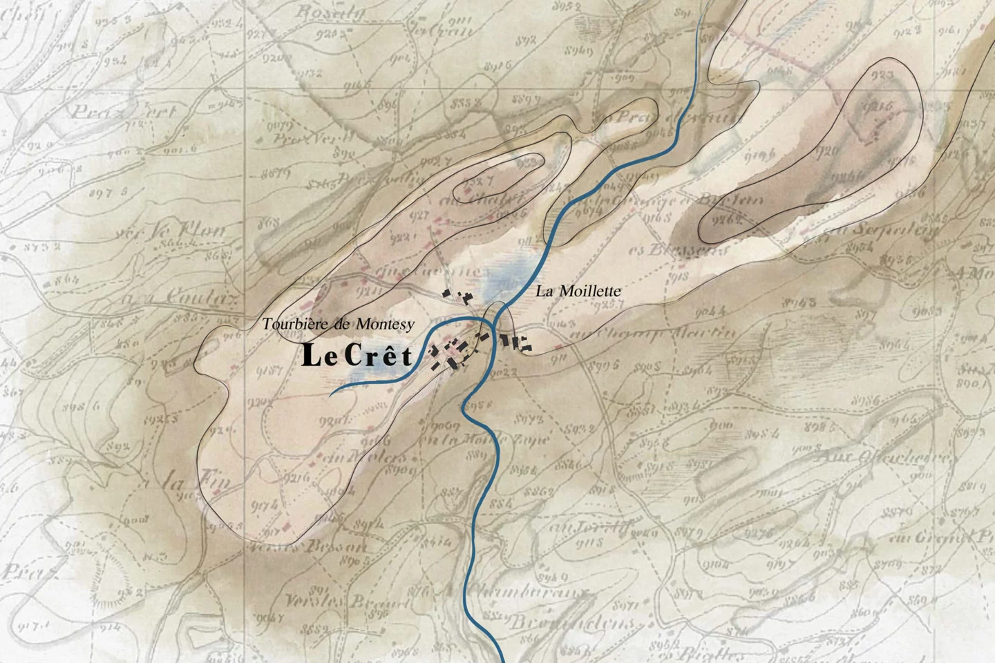 Situation sur une crête au départ d’un ruisseau, dans un terrain vallonné, dont les replats marécageux sont d’anciennes tourbières. Typonomie: Le Crêt, La Molliette, La Tourbière de Montesy, petit marais.