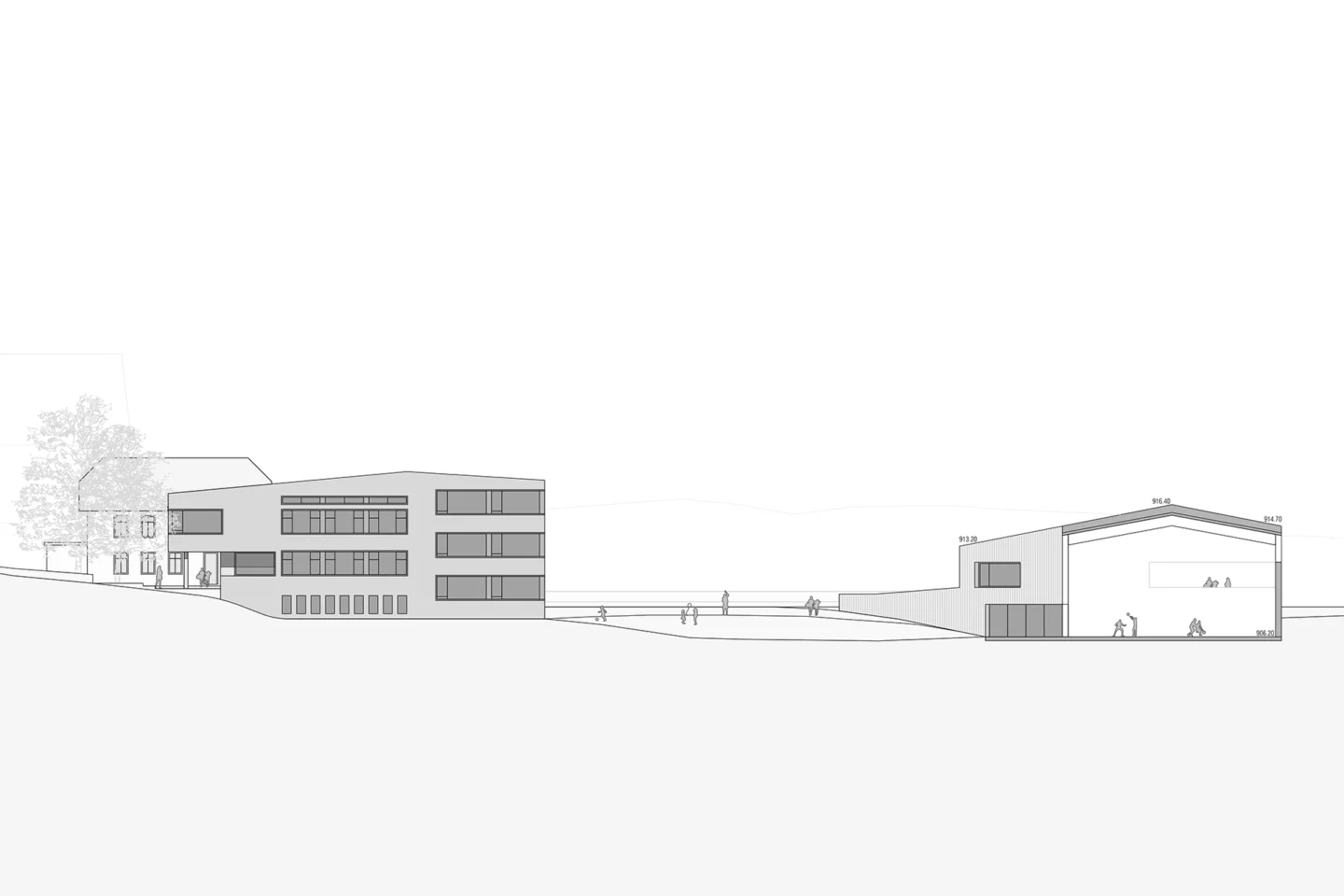 Les nouvelles classes sont construites de part et d’autre de l’école existante, ainsi intégrée dans le nouveau bâtiment de l’école.
