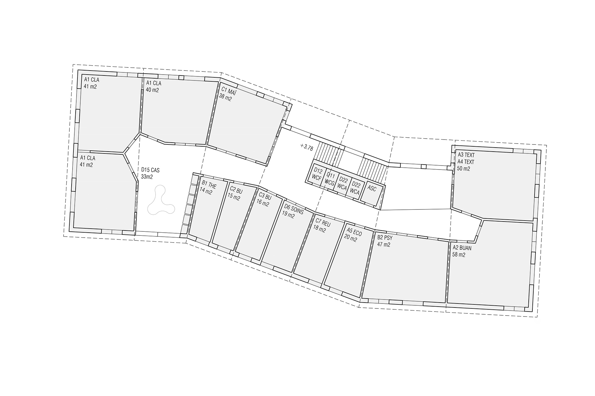 La descente des charges s’effectue le long des chants structurels correspondant au plissage de la toiture (faîtes et noues). Le plancher d’étage et la toiture sont composés de caissons bois apparents, associés à une chape, ce principe permet d’intégrer les techniques d’acoustique, l’isolation thermique et phonique.