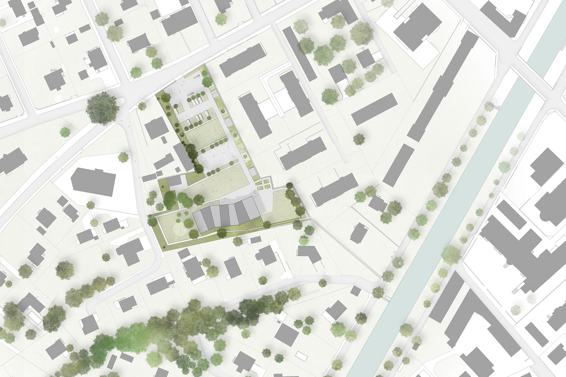 La nouvelle école forme une entité avec le parc auquel elle donne un rôle urbain: il va à la rencontre des habitants et de la ville et répond au front de rue. le parcours est redéfini: depuis la cour d’entrée, le visiteur longe un jardin communautaire et pédagogique aboutissant au préau de l’école. Le promeneur peut ensuite rejoindre la rue des Berges et continuer sa balade le long de la Broye.