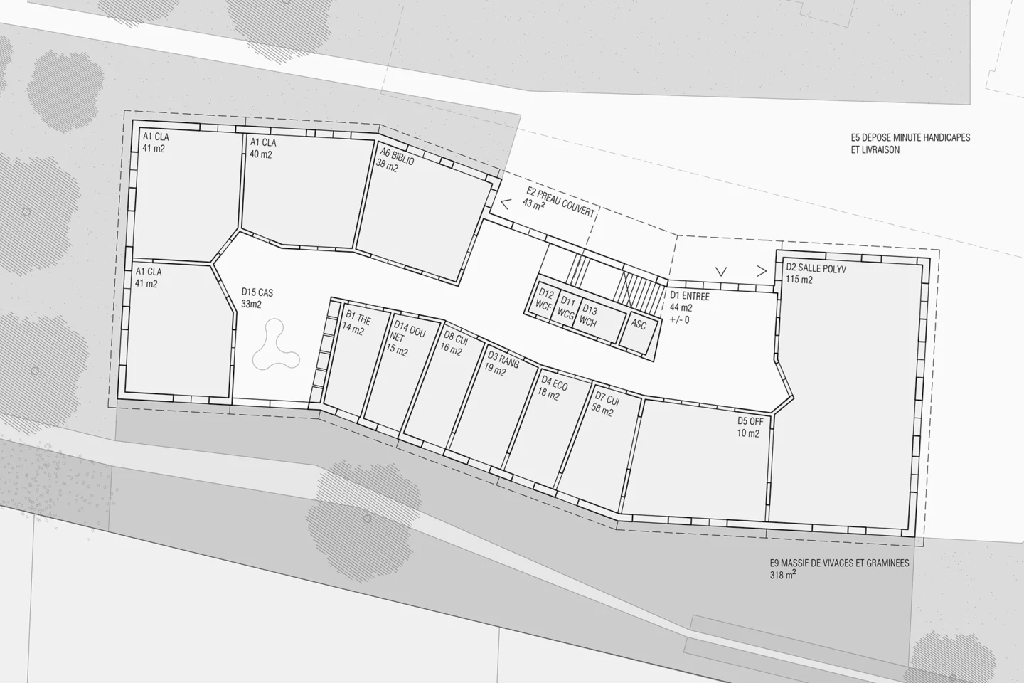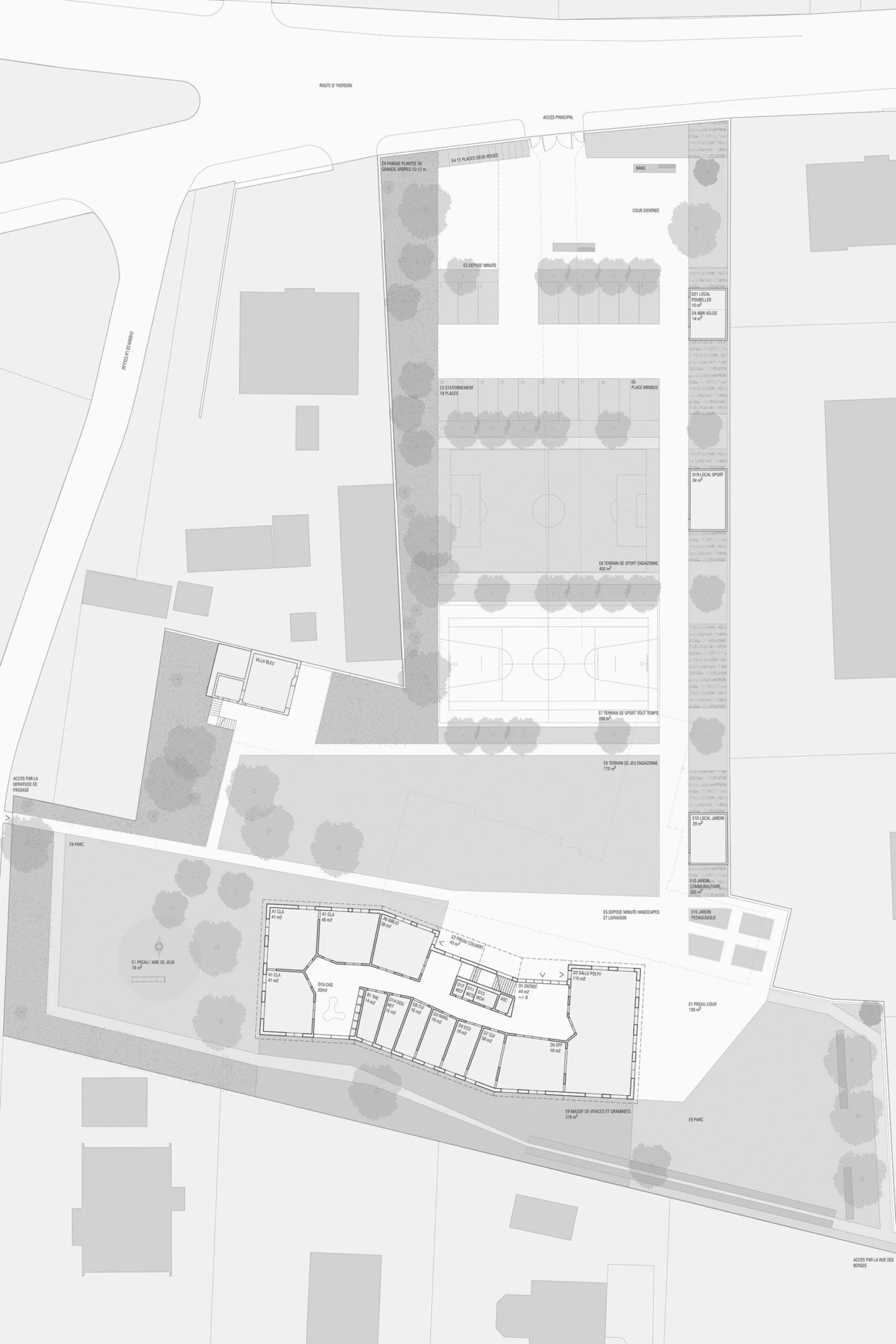 Le couvert d’entrée répond au parc urbain et regroupe les accès à l’école, au réfectoire et à la bibliothèque publique. Les salles de classes à l’ouest se situent dans la partie la plus calme du parc. Les salles de classes à l’ouest se situent dans la partie la plus calme du parc. Le volume est creusé par une rue intérieure qui relie les différentes entités programmatiques. À l’étage, le parcours est accompagné par les vagues de la toiture. Un jeu d’ouvertures apporte lumière naturelle et vue, créant ainsi un dialogue entre la rue et les espaces qu’elle dessert. Les classes s’organisent autour d’un grand espace de vestiaire orienté sud.