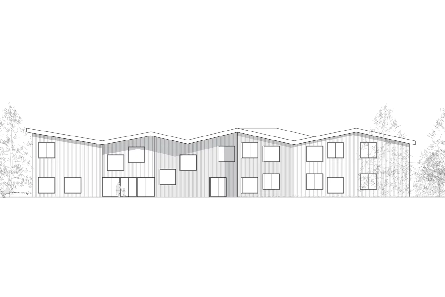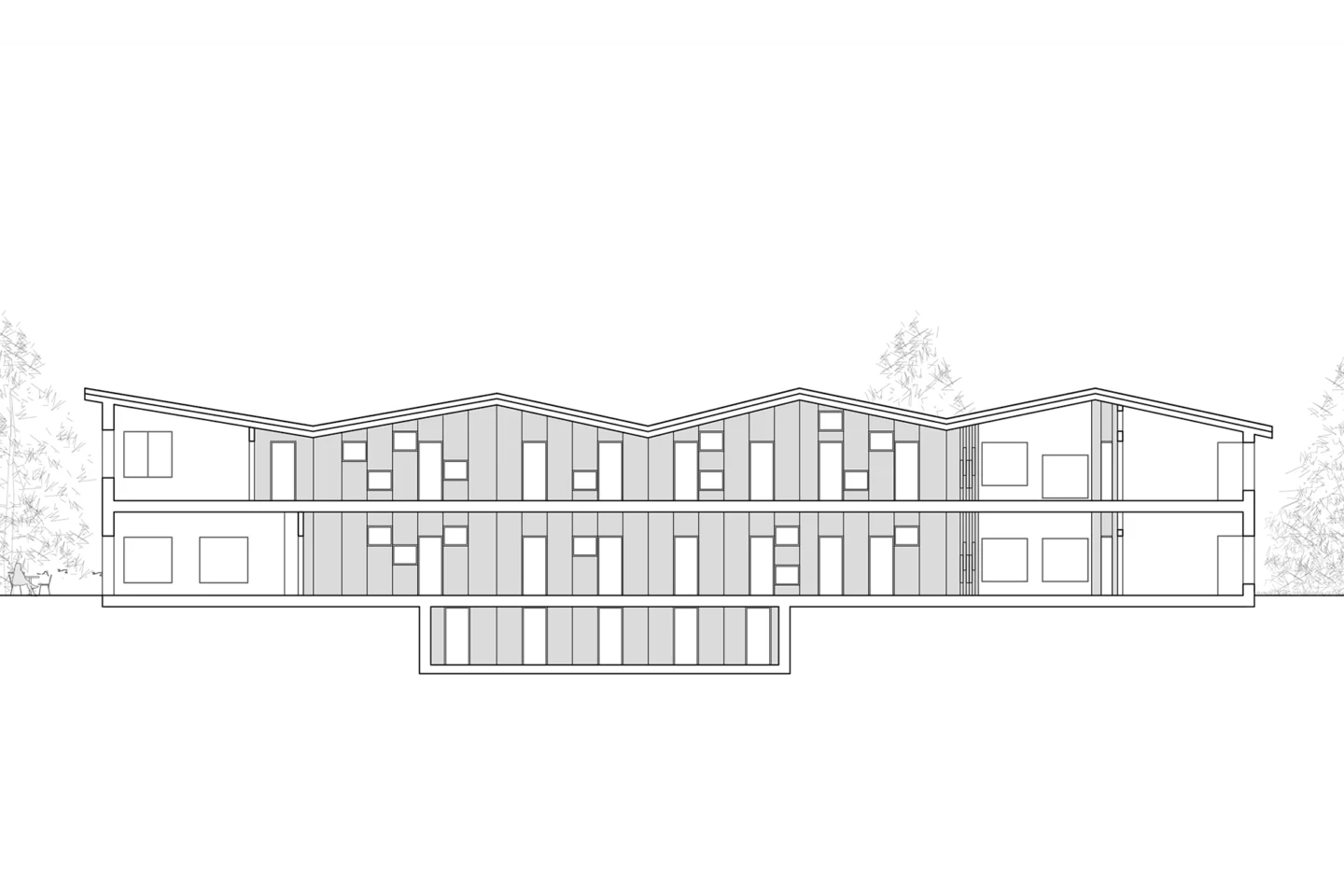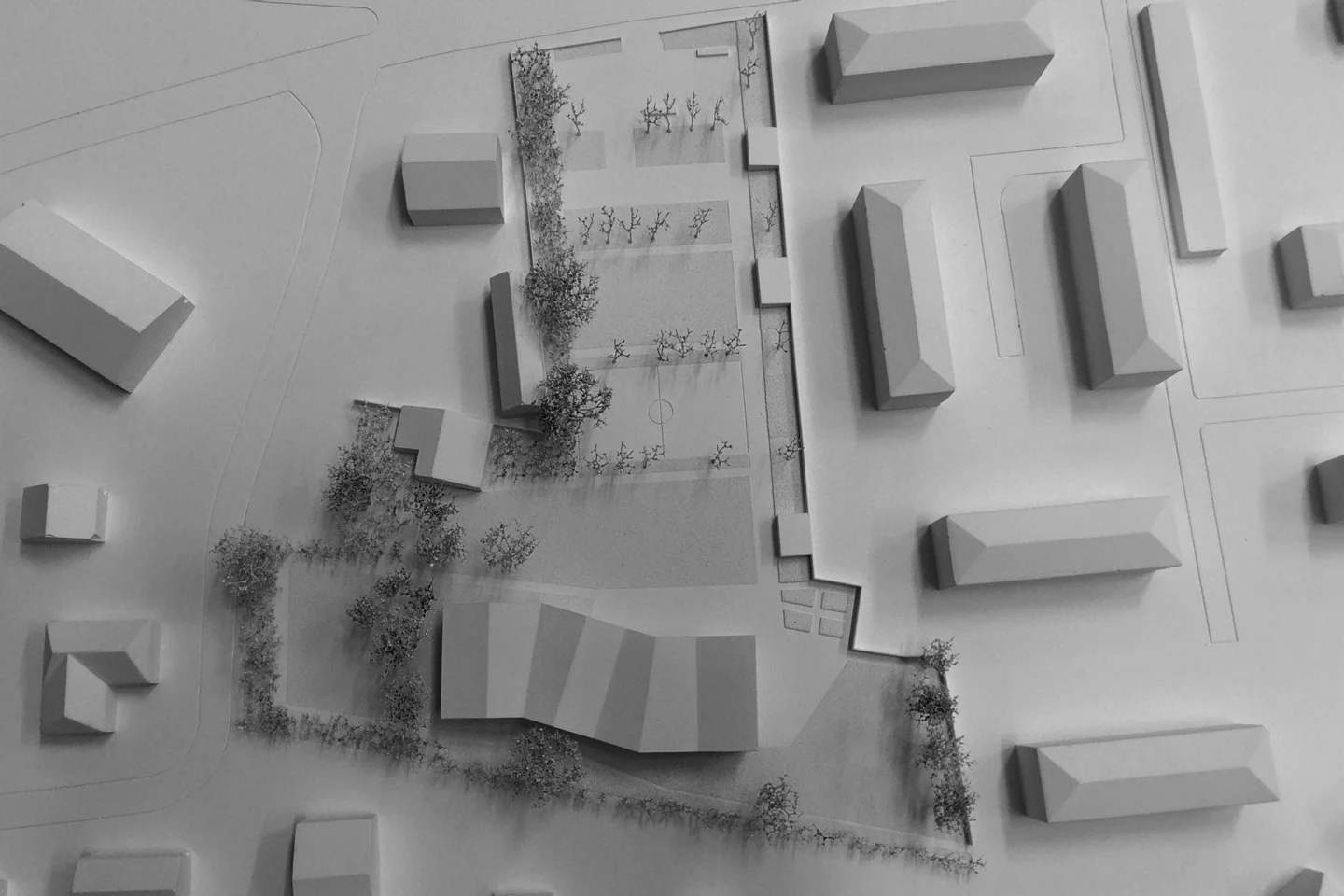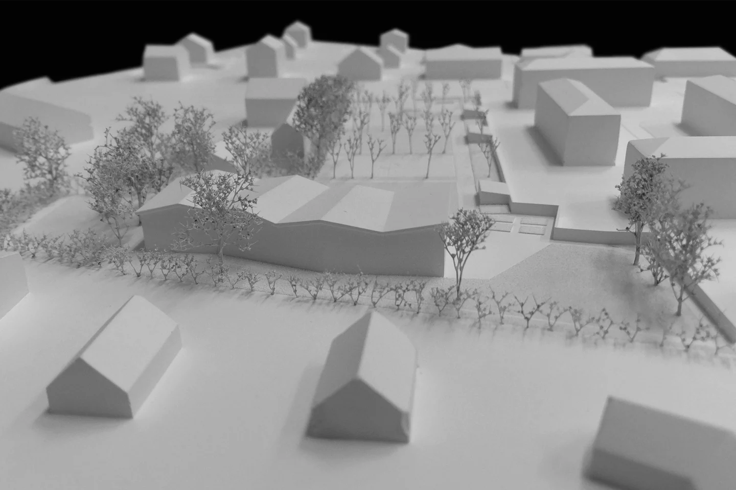 La nouvelle école en Guillermaux s’organise en une seule grande maison et répond à son environnement proche et plus lointain. Par le plissage de la toiture et l’articulation en plan, la volumétrie du bâtiment propose plusieurs lectures: elle réagit à la proximité du ruisseau de la Coula et de la Broye, elle dialogue avec les villas avoisinantes suggérant une série de maisonnées accolées et elle s’affirme comme école faisant face au parc et accueille les usager·ères, tout en se faufilant entre les grands arbres conservés.