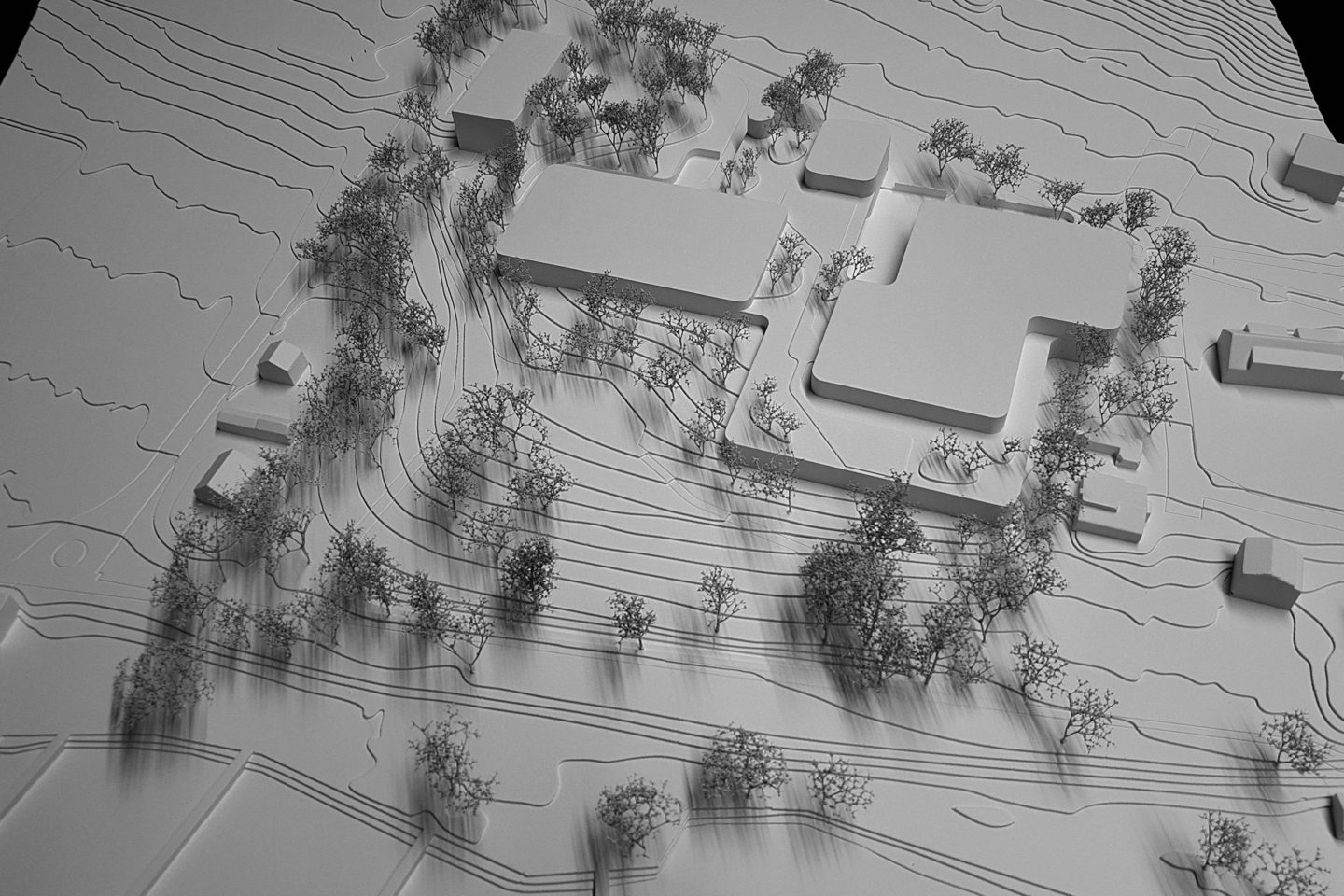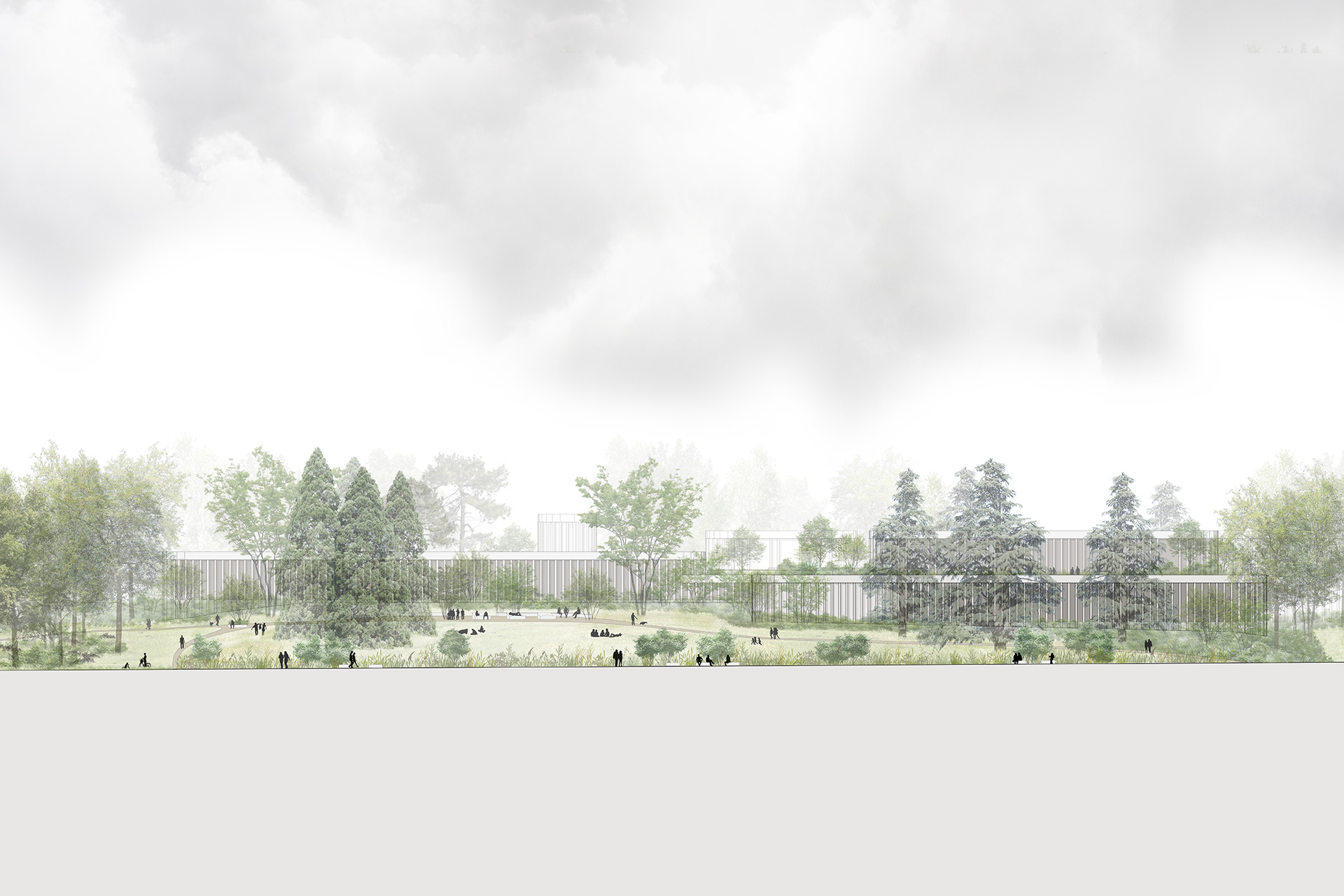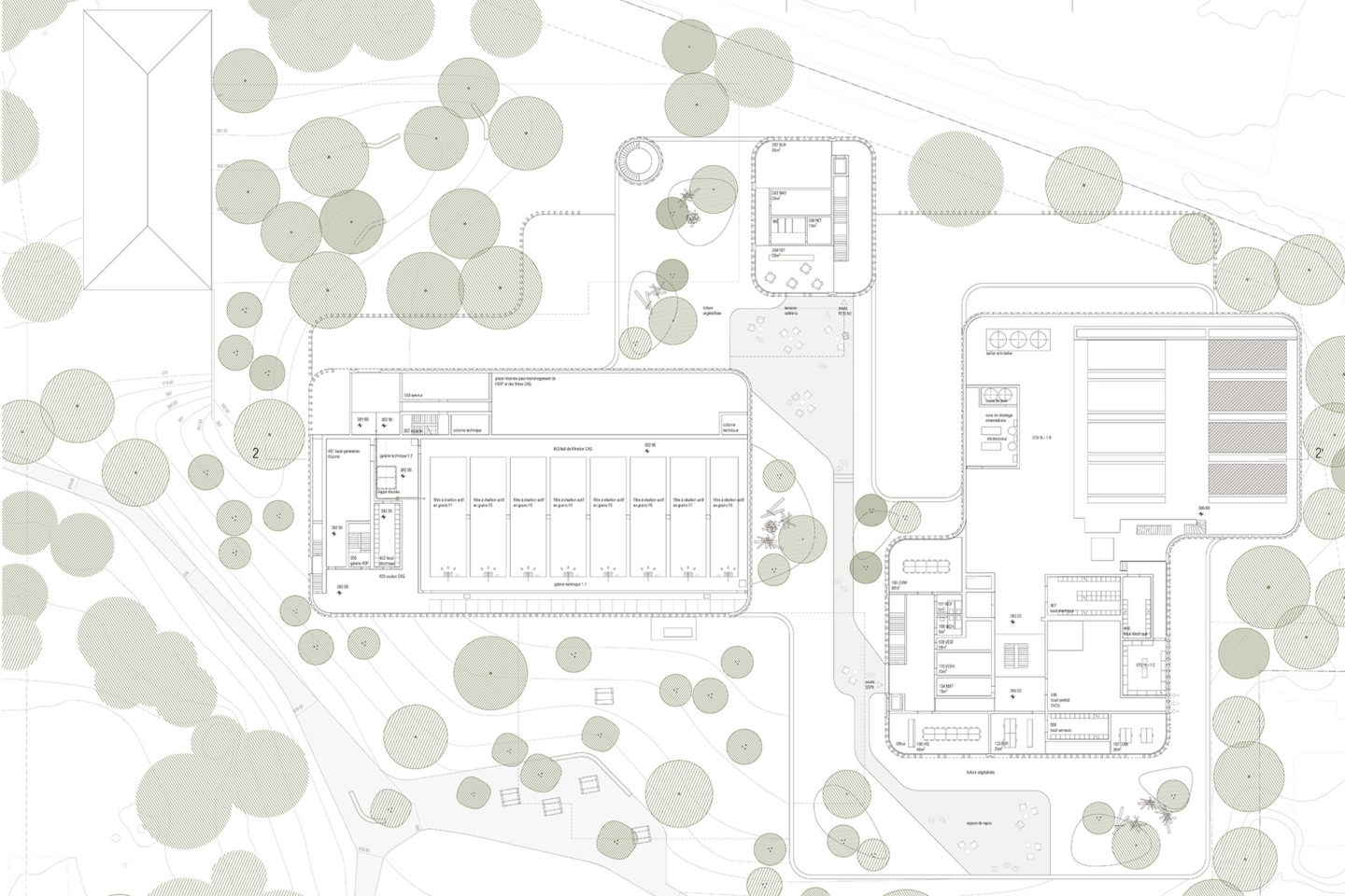 La volumétrie émergeante est amoindrie grâce à la réutilisation d’une partie des déblais pour la mise en forme du terrain. L’articulation des volumes contribue également à en réduire l’impact visuel pour le public.