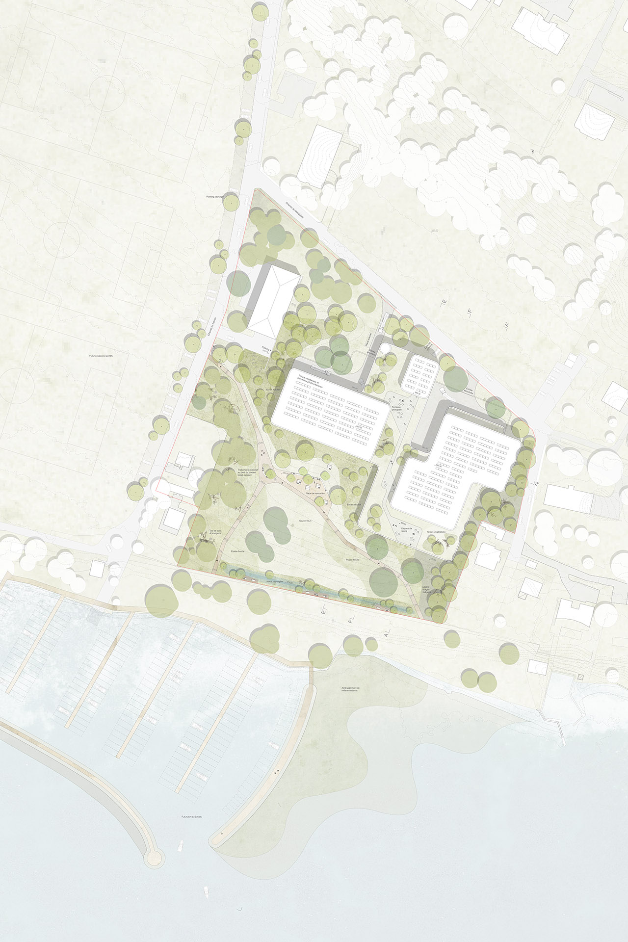 La forme architecturale exprime la structure des bâtiments, les murs porteurs extérieurs créent des espaces de décompression autour des constructions enterrées et immergées. Cette structuration se prolonge sur les façades émergeantes, qui permettent de gérer les diverses parties (pleines, vitrées et ouvertes), tout en préservant la sobriété de l’ensemble.