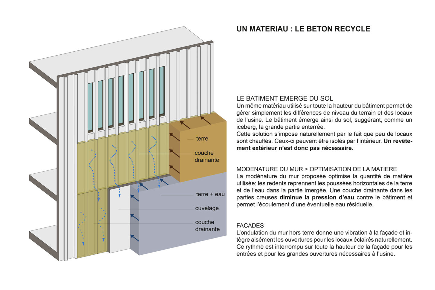 Dans un soucis d’impact écologique de la construction, il a été étudié de réutiliser de la terre pour le remblais lors de l’excavation, de réemployer le béton de démolition pour la fabrication de béton recyclé pour les murs préfabriqués de la nouvelle usine, le parking souterrain est construit dans une partie du sous-sol du bâtiment existant et les sous-sols des bâtiments existants sont comblés pour permettre la plantation pleine terre.