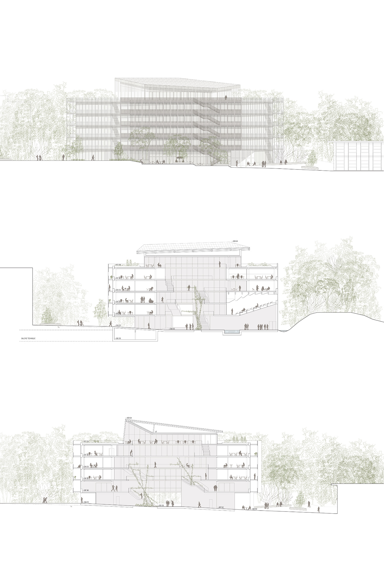 Le projet tire profit de l’existence d’une végétation luxuriante bien installe, en particulier les parties boisées des moticules artificiels: la façade Est « plonge » dans la forêt, bénéficiant ainsi de fraîcheur et d’ombre jusqu’au 4e étage. Tout complément d’ombre portée construite est superflu.