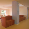 En premier lieu, l’intervention requalifie les espaces communautaires (entrées, séjours): ils deviennent articulations spatiales et apportent lumière naturelle et vues sur le paysage jusqu’au couloir central hérité de l’organisation hospitalière. La redéfinition de l’entrée principale clarifie la distinction entre les différents secteurs.