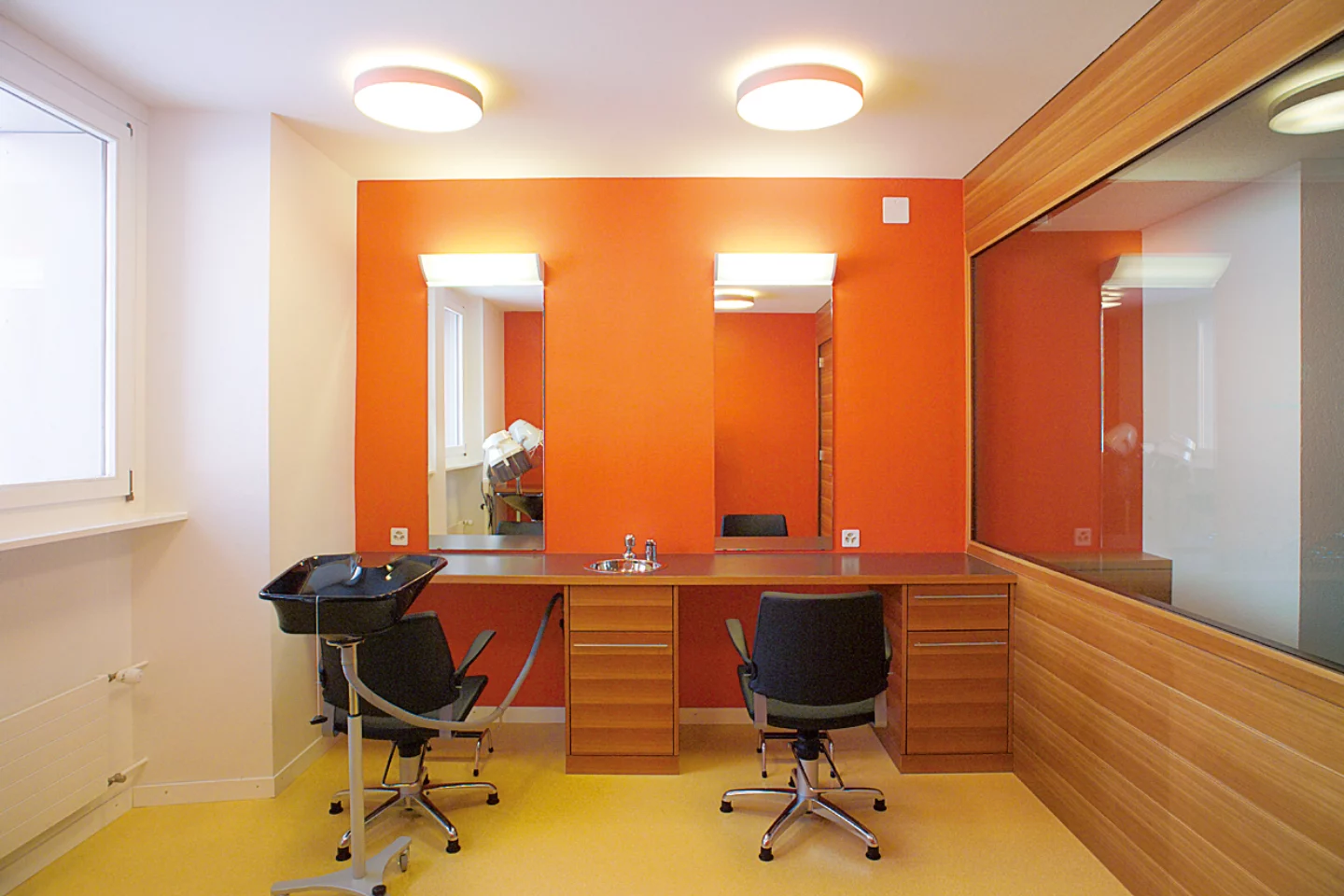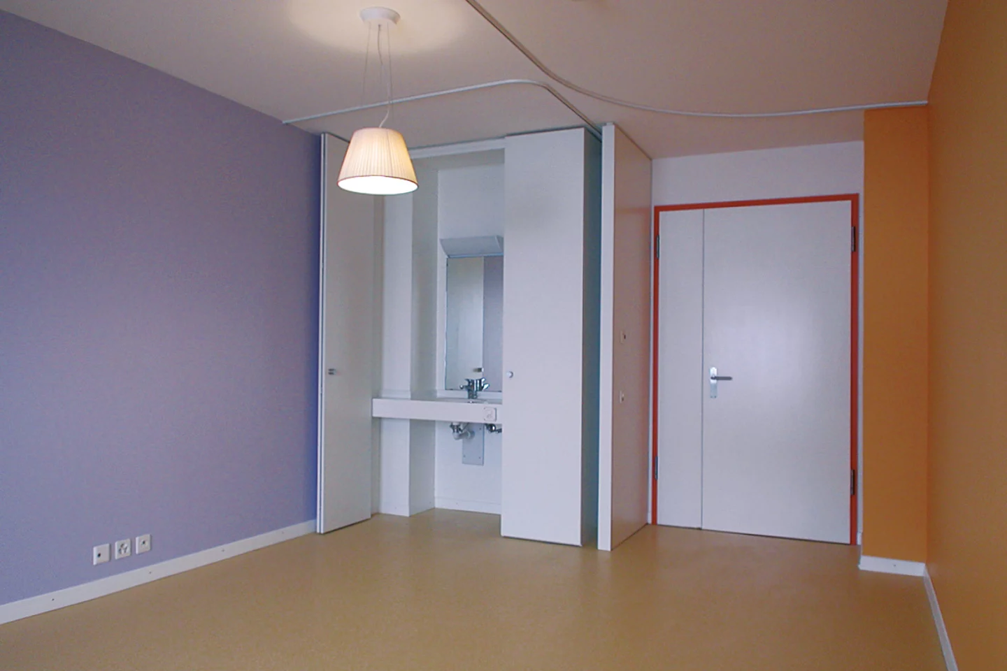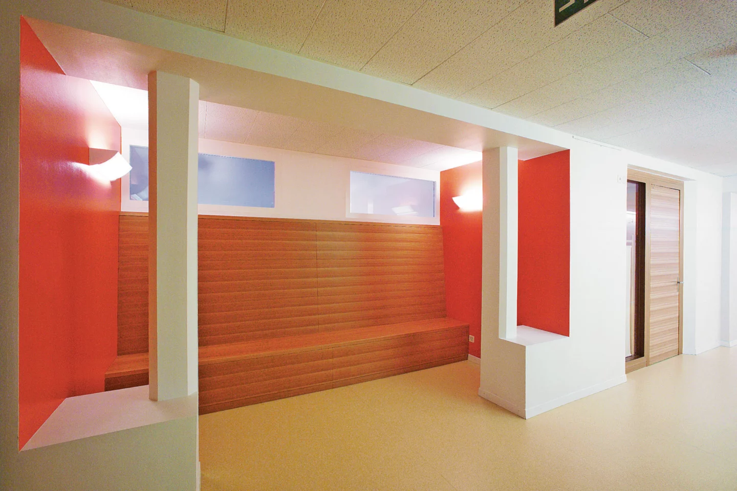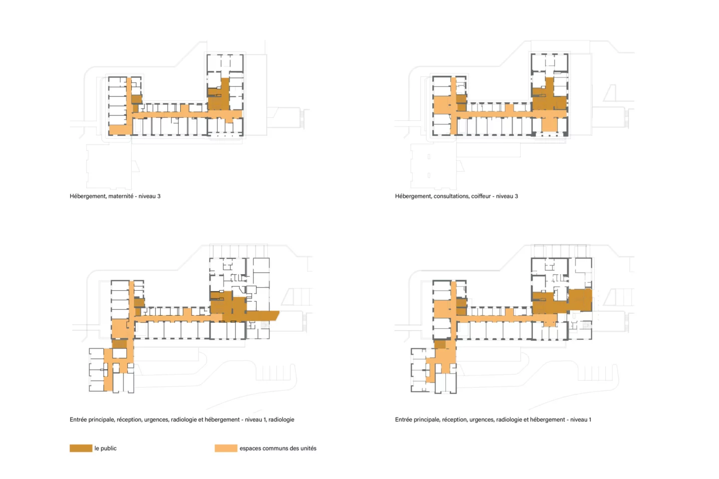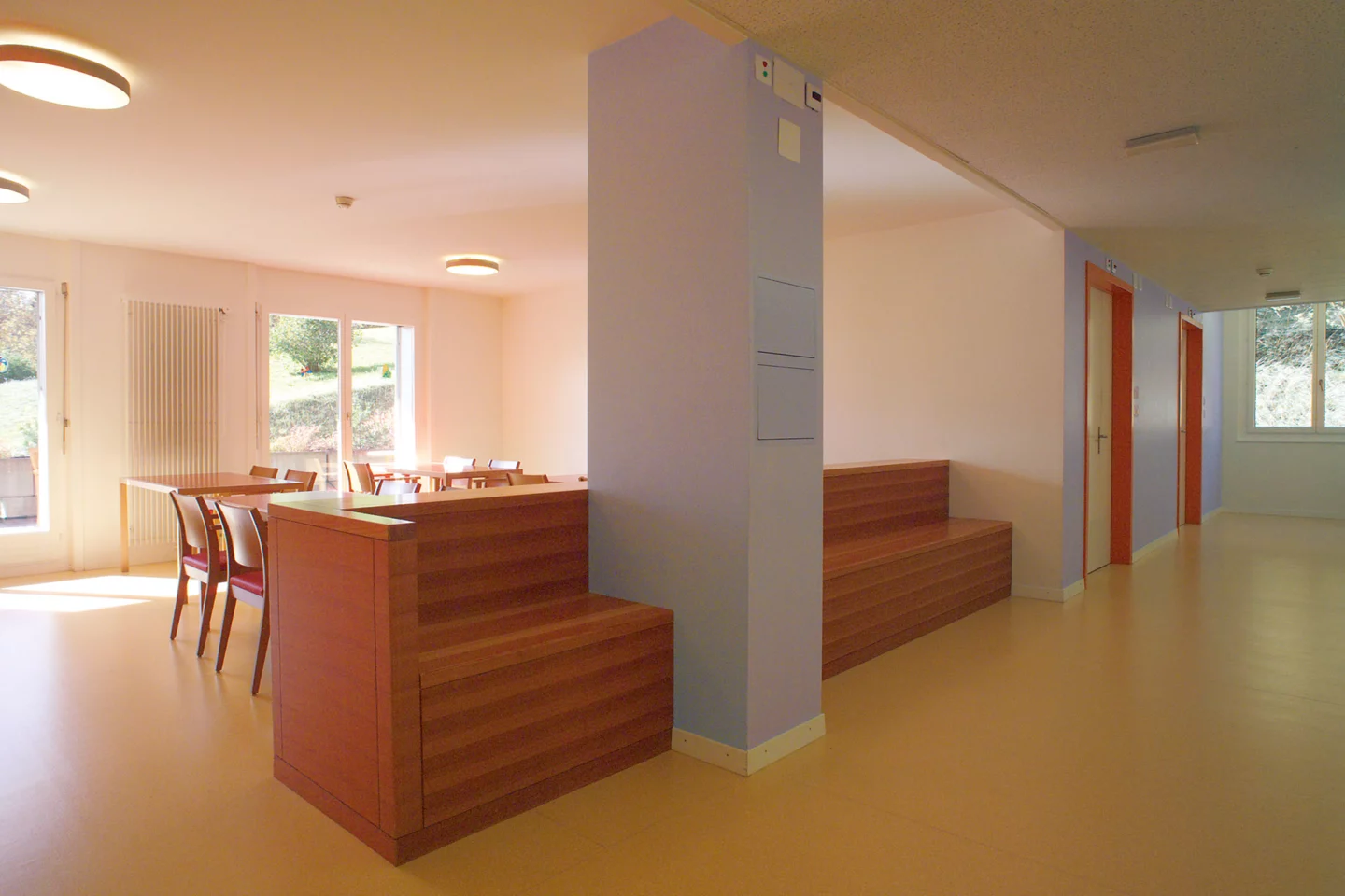 En premier lieu, l’intervention requalifie les espaces communautaires (entrées, séjours): ils deviennent articulations spatiales et apportent lumière naturelle et vues sur le paysage jusqu’au couloir central hérité de l’organisation hospitalière. La redéfinition de l’entrée principale clarifie la distinction entre les différents secteurs.