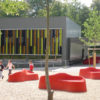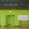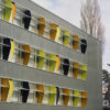 Le projet réunit les deux bâtiments existants par le nouveau traitement des façades, isolées et doublées d’un bardage en zinc-titane de couleur neutre. L’accent est porté sur les façades principales, au sud pour l’école et à l’est pour la salle de gymnastique. Elles sont constituées de brise-soleil fixes aux couleurs vives.