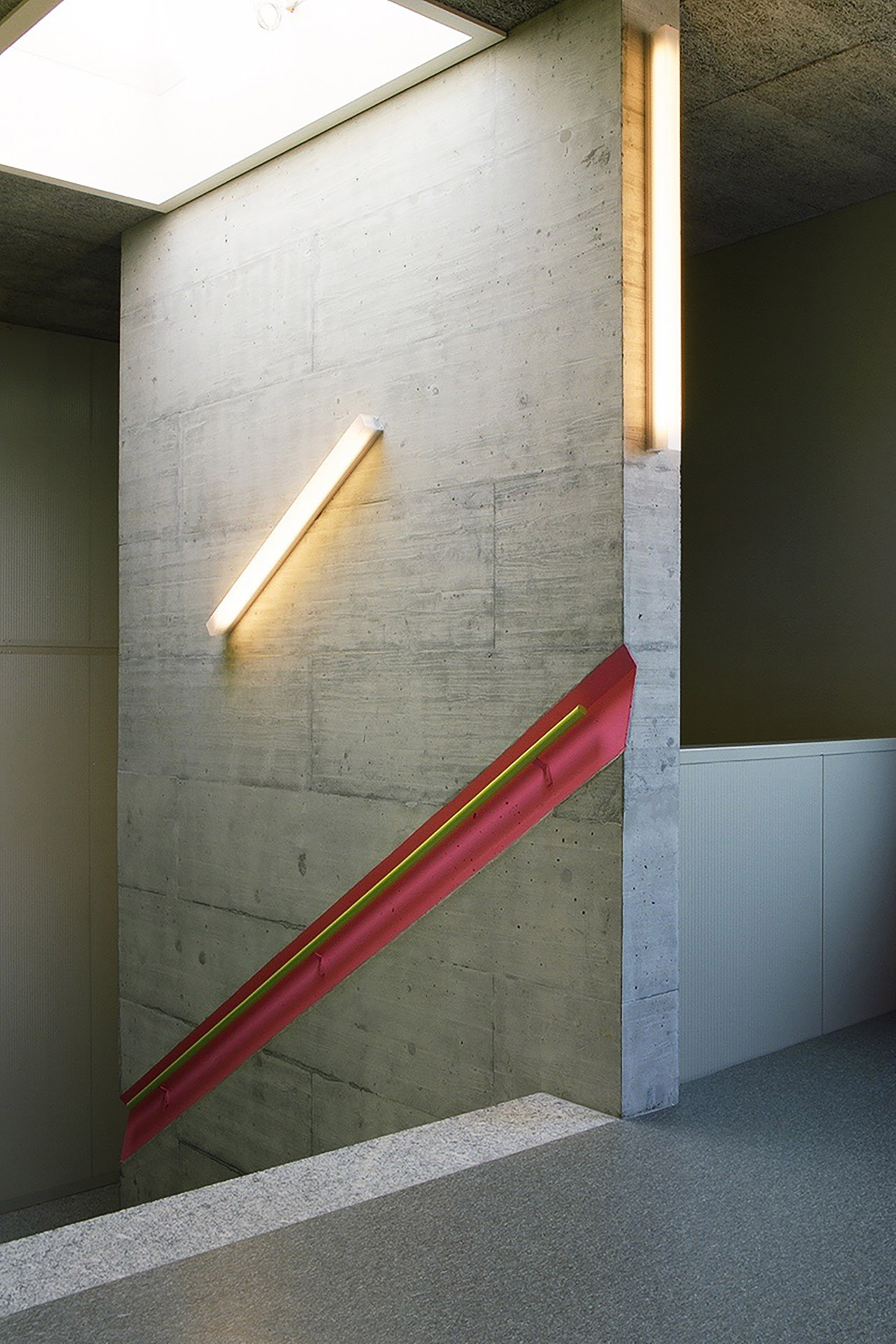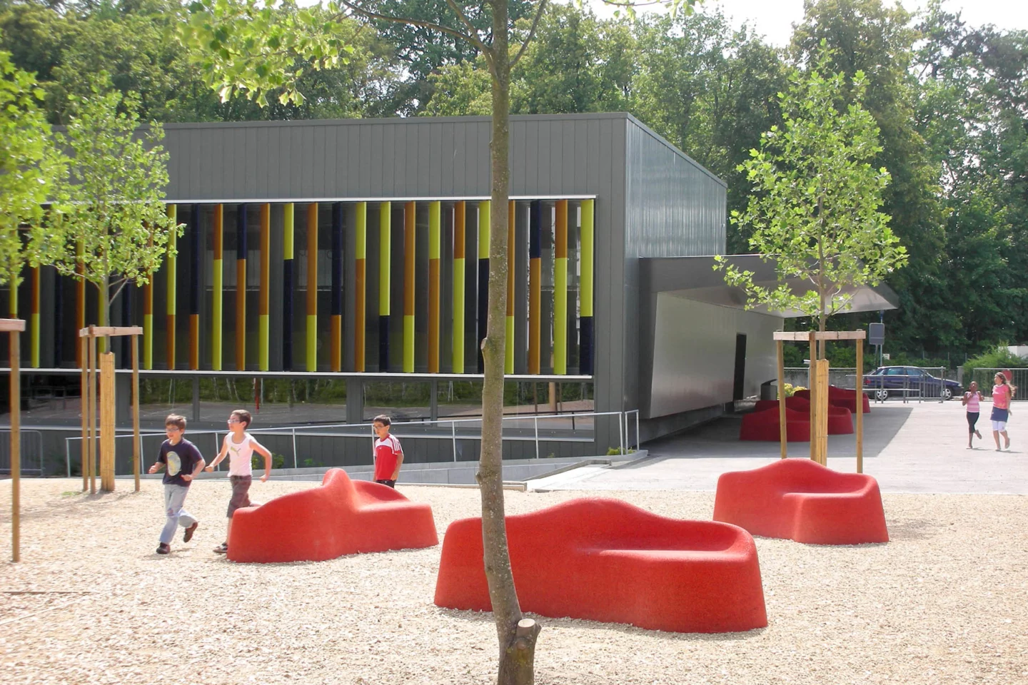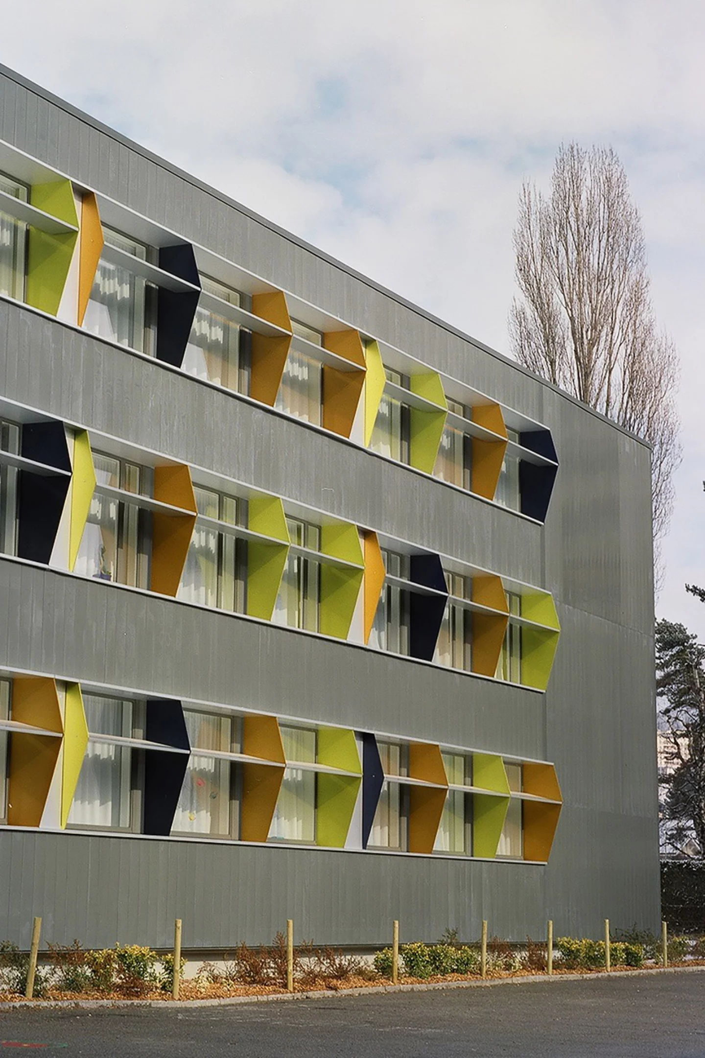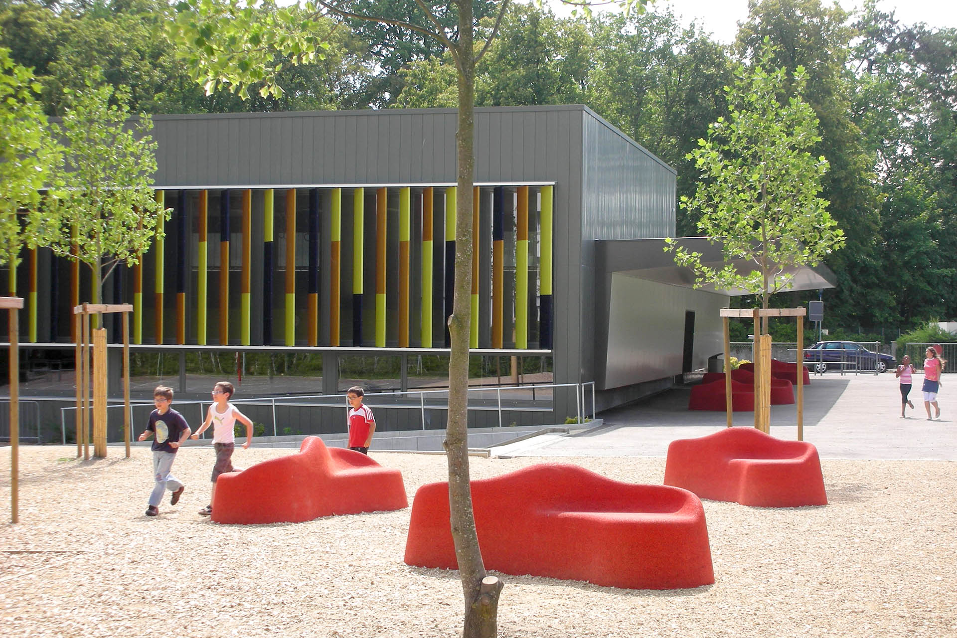 Le projet réunit les deux bâtiments existants par le nouveau traitement des façades, isolées et doublées d’un bardage en zinc-titane de couleur neutre. L’accent est porté sur les façades principales, au sud pour l’école et à l’est pour la salle de gymnastique. Elles sont constituées de brise-soleil fixes aux couleurs vives.