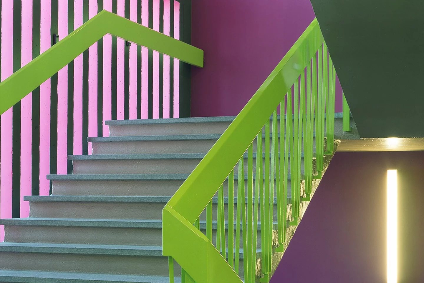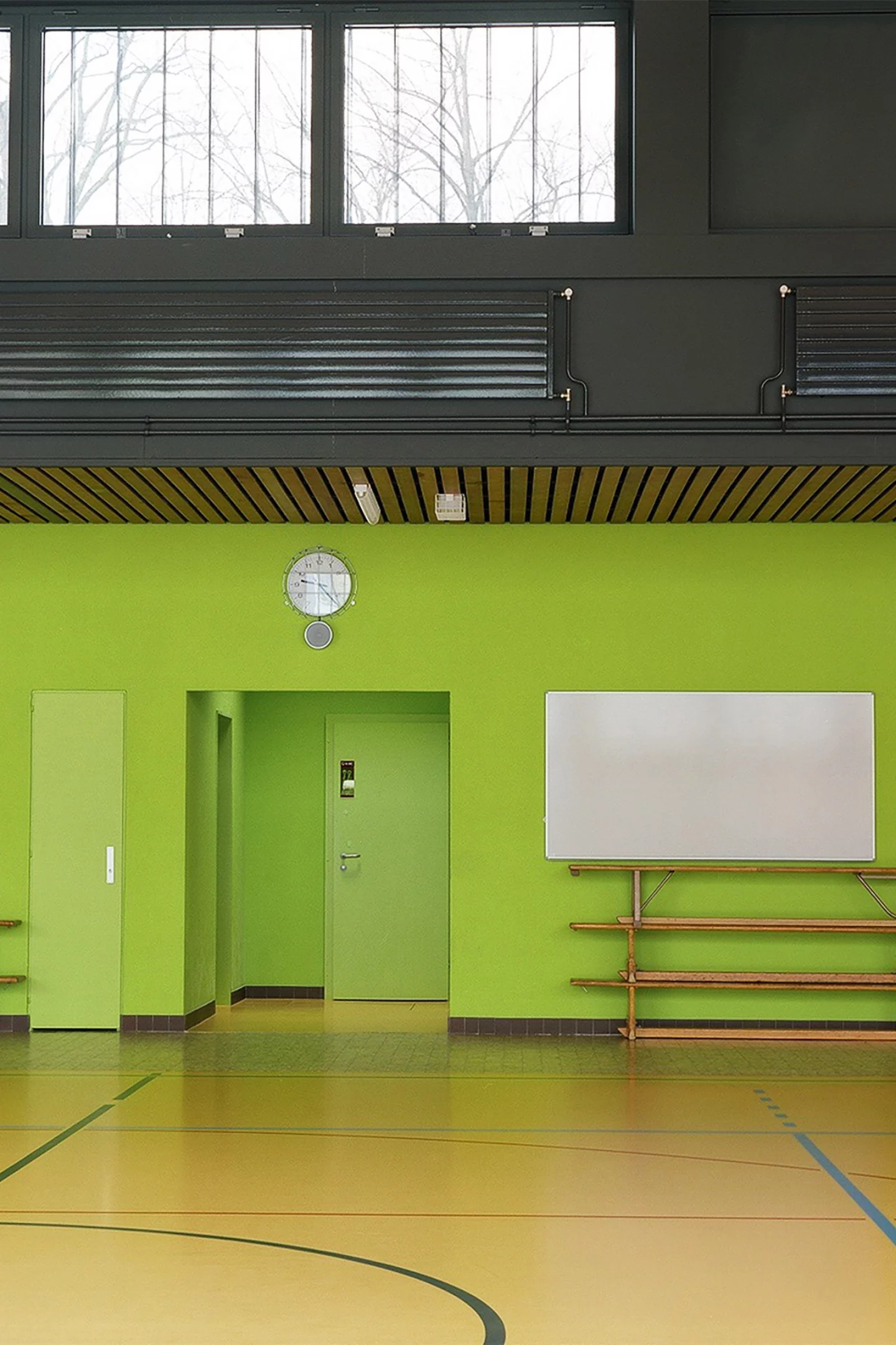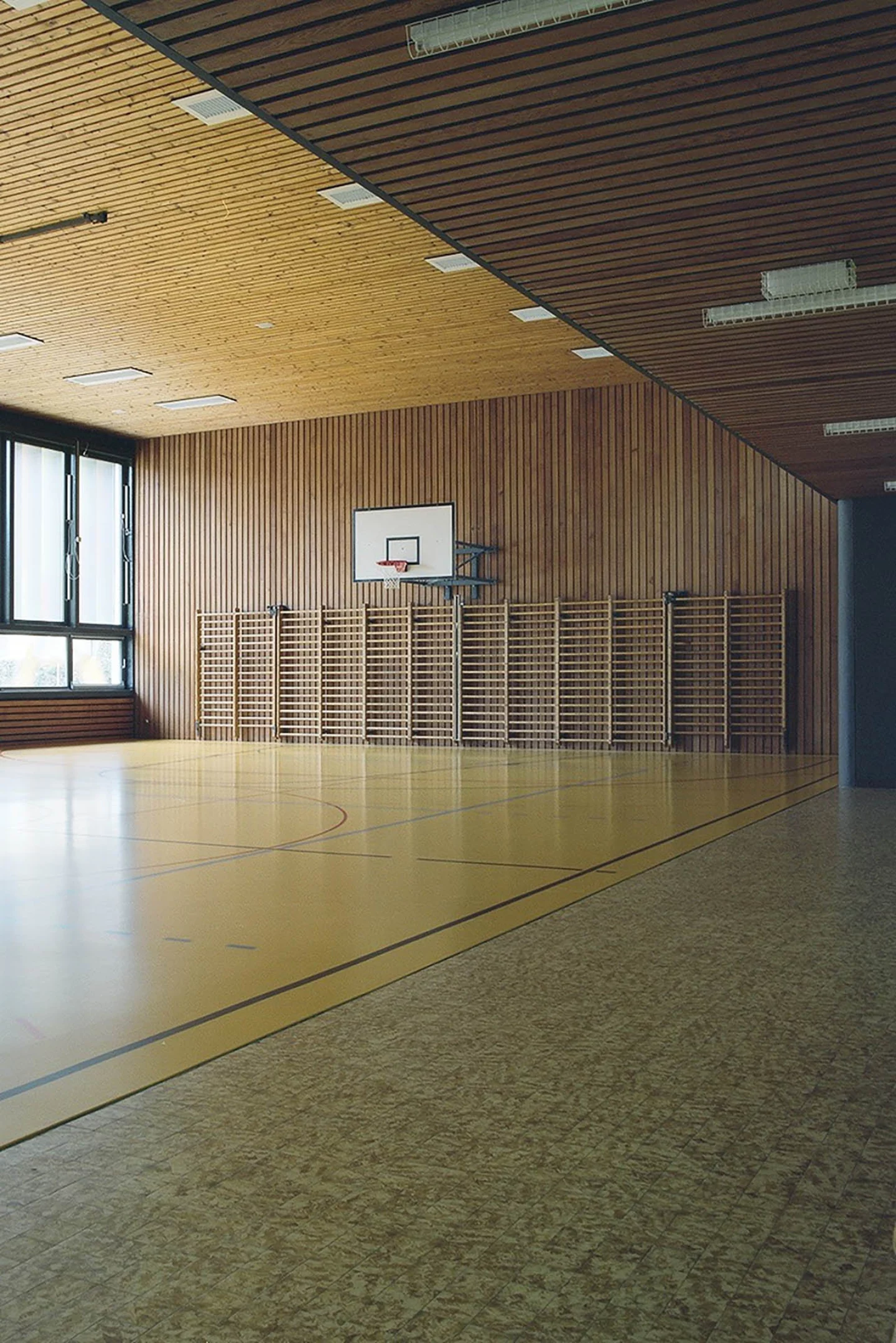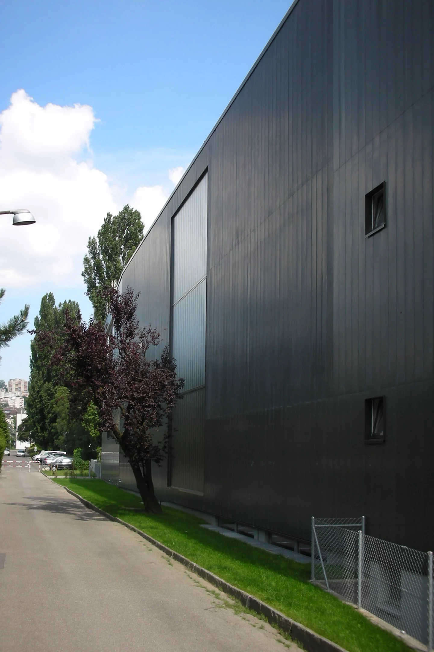 Le projet réunit les deux bâtiments existants par le nouveau traitement des façades, isolées et doublées d’un bardage en zinc-titane de couleur neutre. L’accent est porté sur les façades principales, au sud pour l’école et à l’est pour la salle de gymnastique. Elles sont constituées de brise-soleil fixes aux couleurs vives.