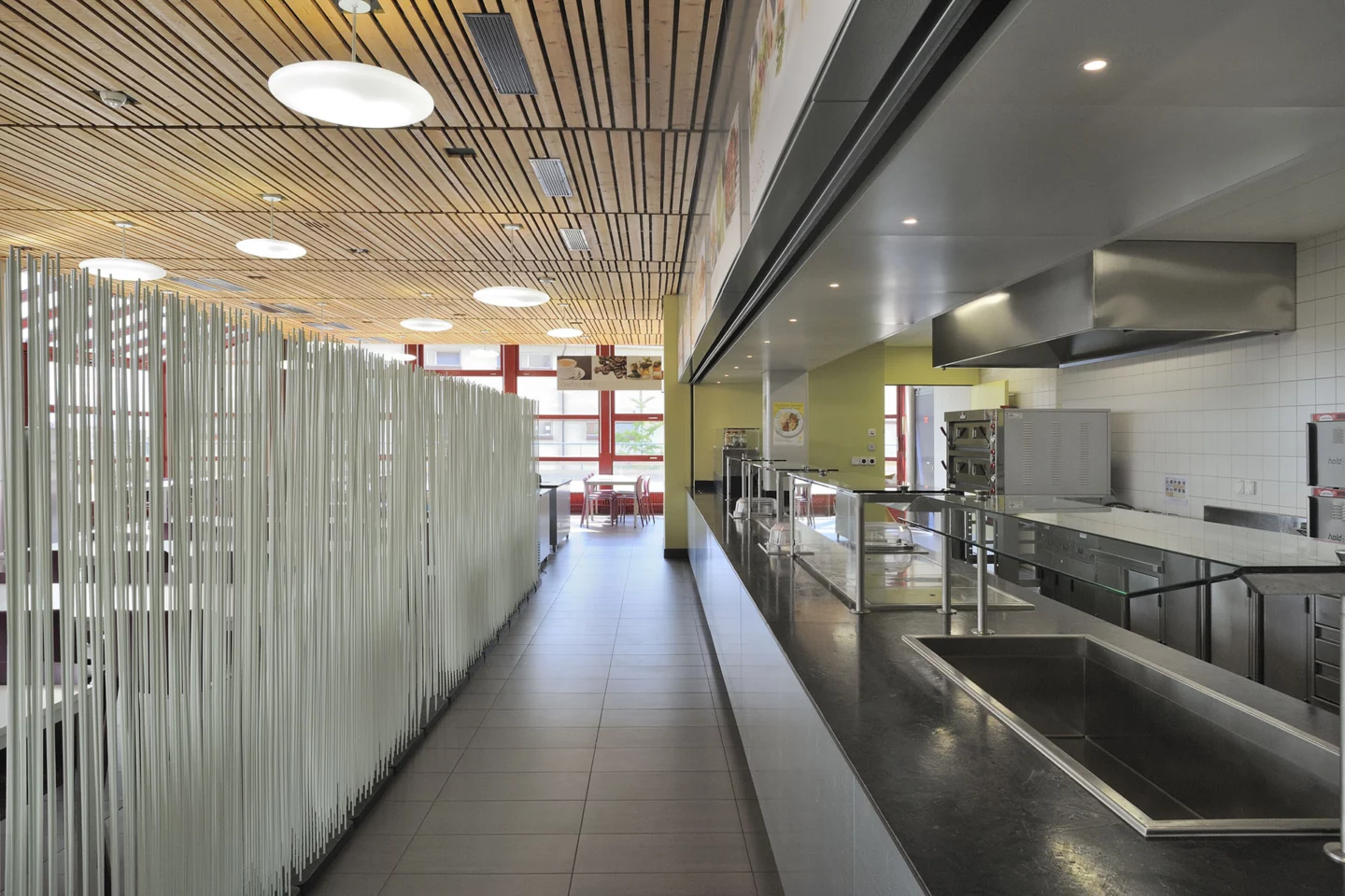 Le premier projet a porté, pour sa mejeure partie, sur l’assainissement des installations techniques (ventilation, régulation, éclairage). À ces interventions s’ajoutaient la transformation de la cuisine professionnelle et du self-service.