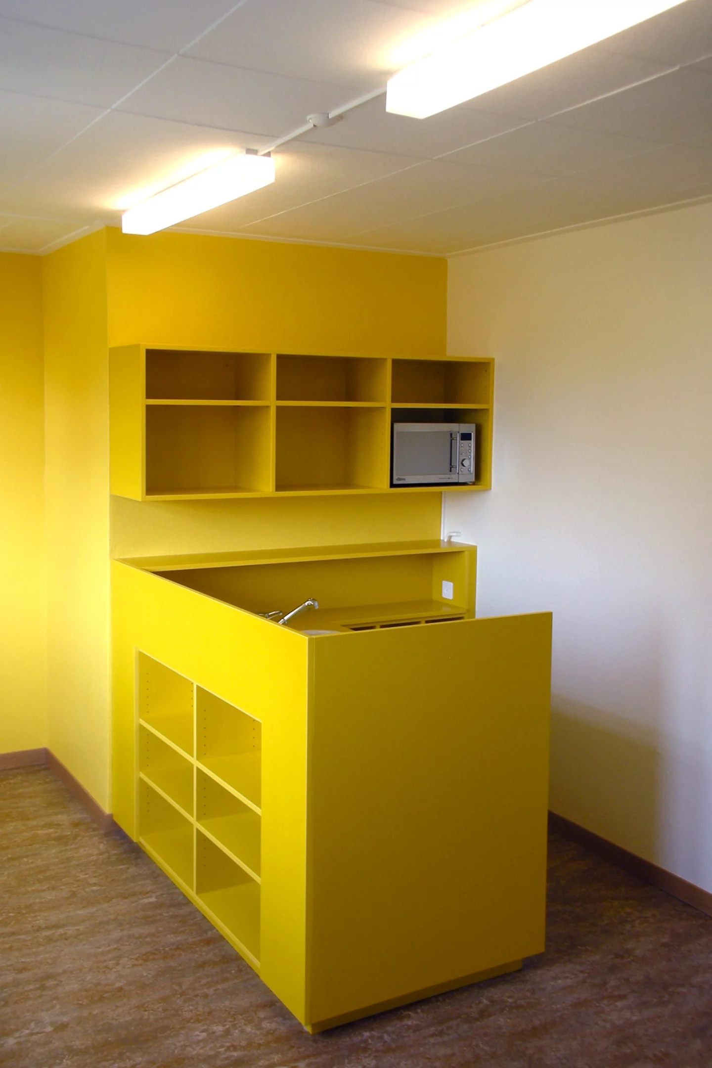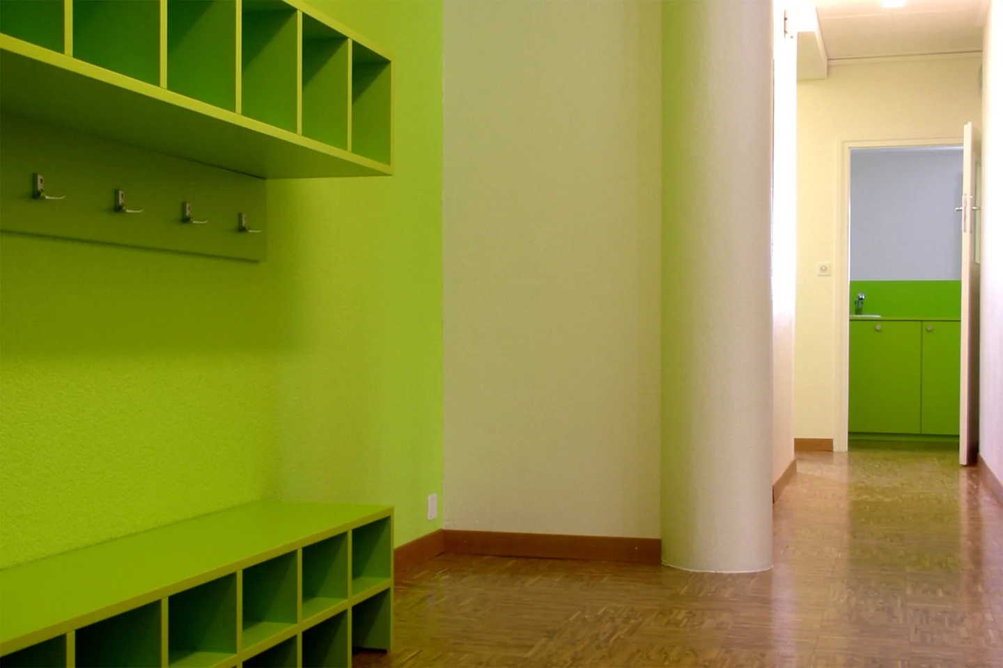 Quelques interventions très ponctuelles ont permis d’adapter d’anciens bureaux aux exigences de l’accueil de petits enfants (bébés à écoliers), en respectant un cadre financier très réduit: décloisonnement pour l’apport de lumière naturelle, insertion de nouveaux agencements, remplacement de revêtements de sols.